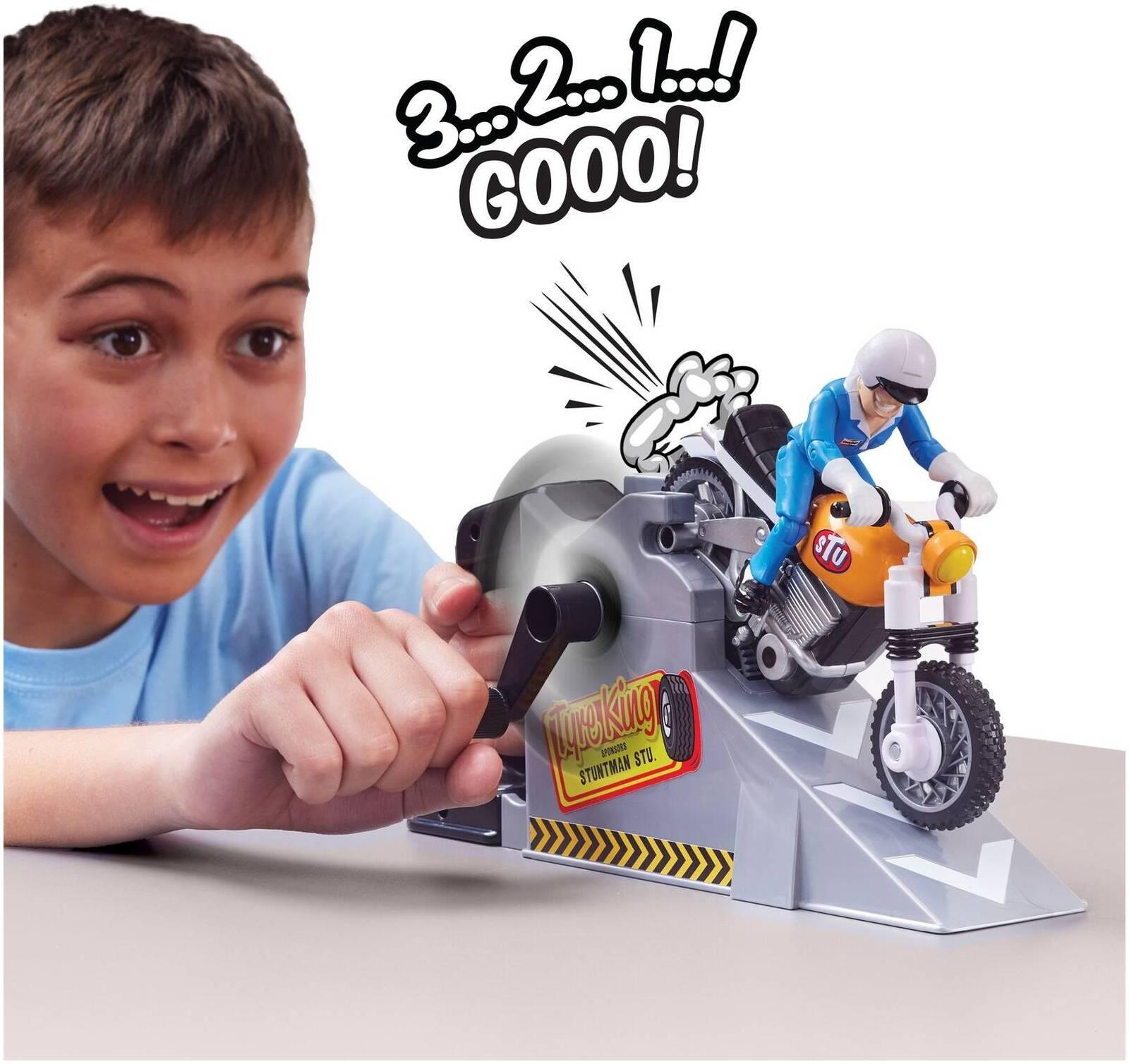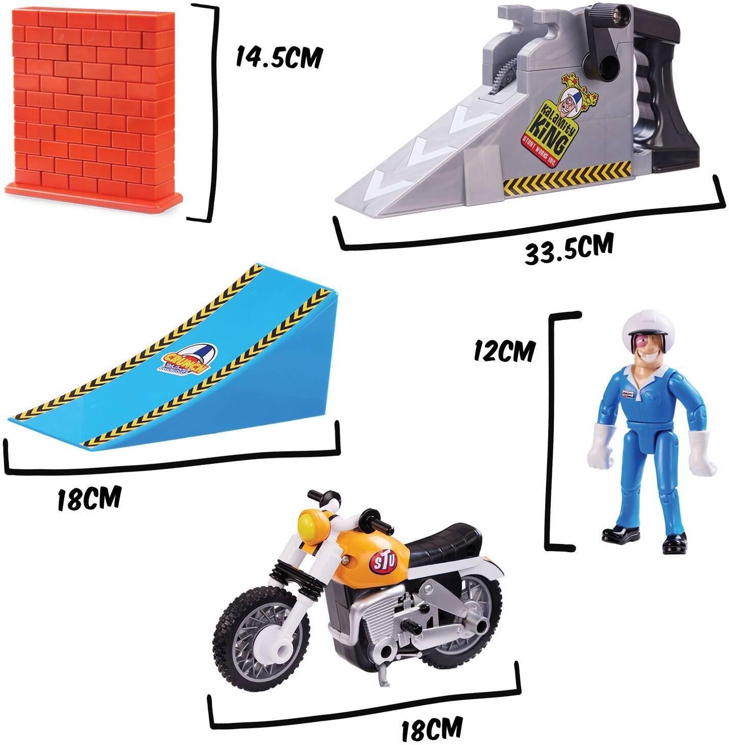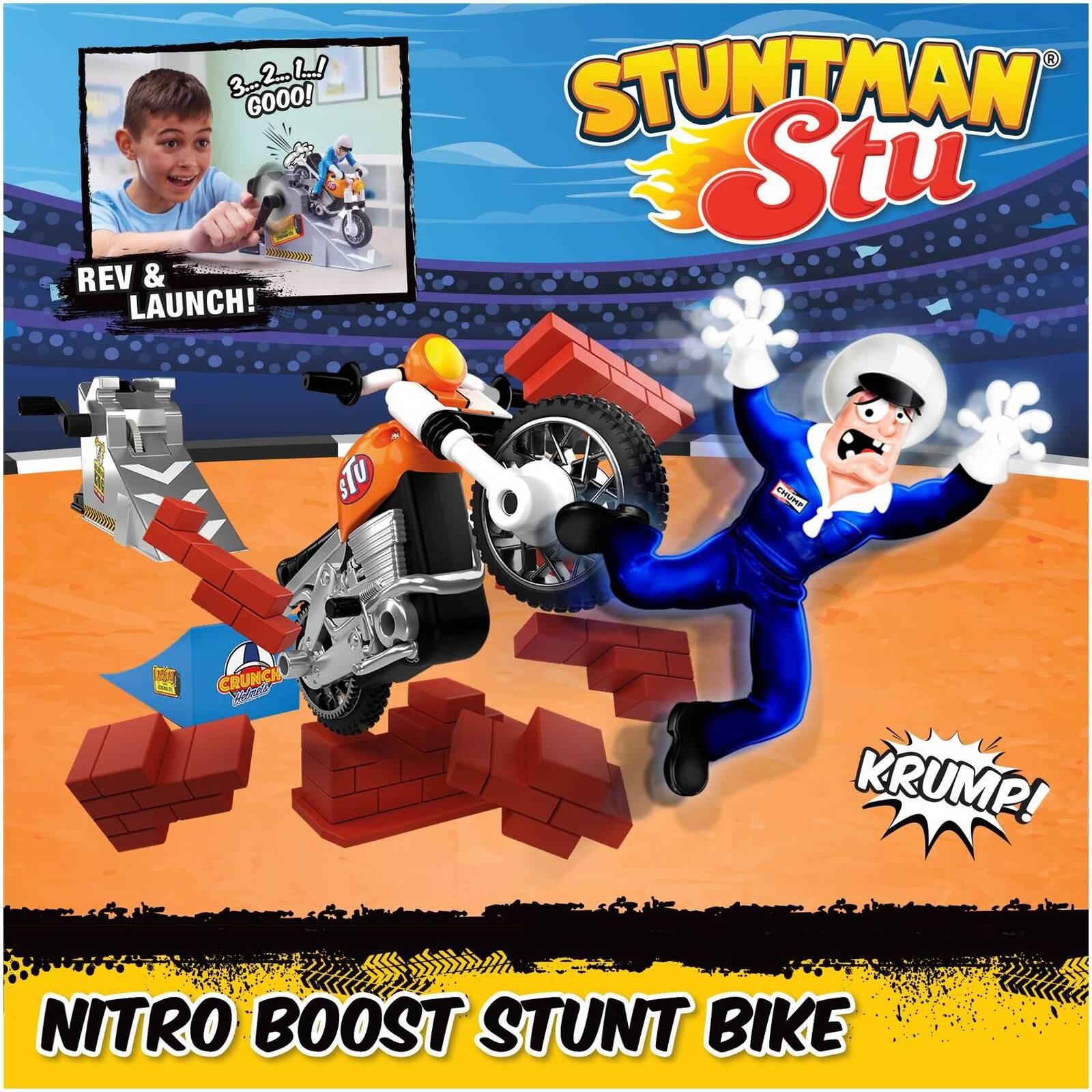 There's no outrageous stunt this daredevil won't try! Meet Stuntman Stu, the World's craziest stuntman. His latest stunt is the Nitro Boost Stunt Bike, a daring wall jump launch from a curved ramp. Will Stu make it? Who can say? But if he crashes into the wall, it'll smash apart stu-pendously!Wind the handle on the launcher to rev up the 18cm Nitro Boost Stunt Bike, and launch Stu from the ramp! Despite his best planning, there's no telling if Stu will make the jump, or smash into the break-apart wall! And with articulated joints for poseable play, who knows what position Stu will end up in?12cm Stu is comically injured if his stunts come crashing down, but there's no awesome stunt he won't try! With a fine line between a safe jump and an epic fail, he really does put the Stu in stu-pid! Create fun stunts for endless replayable fun, and make your own DIY launch ramps to get creative!*Features:** Rev and launch the Nitro Boost stunt bike, and daredevil Stuntman Stu blasts-off for a risky wall jump!* Will Stu make it over the wall or smash it apart? Who knows? There's no extreme stunt Stu won't try!* Wind the handle on the bike launcher, then release it to send Stu shooting from the curved ramp* The break-apart wall is the perfect jump challenge! Crash and it smashes apart into 8 pieces!* 12cm Stuntman Stu is poseable for extra crash stunt action! Who knows how he'll end up?* Suitable for ages 5+ years