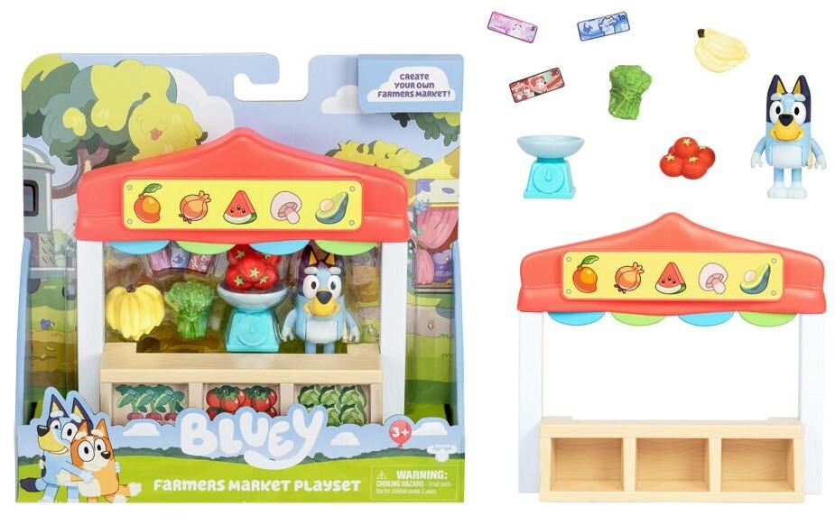 *Bluey: Farmers Market – Mini Playset*Bring home the fun of Bluey with the Bluey Mini Playsets!Join Bluey and Bingo as they play with Turtleboy in the Playground or buy their favorite things at the Farmers Market. Both Mini Playsets come with articulated figures with moving arms and bodies, as well as some fun accessories to recreate some of the most memorable moments from the show!*Features:** Create Fun Stories With The Bluey Figures – The Farmers Market Mini Playset is the perfect size for all other Bluey figures (sold separately). Kids will love to make up stories and adventures with this great toy.* Toys That Spark Imagination – As well as recreating their favorite scenes from the TV show, this Bluey mini playset will help spark children's ima­ginations and allows them to create new Bluey adventures and stories. \* \* They are ideal for storytelling and playtime!*Suitable for Ages 3+*
