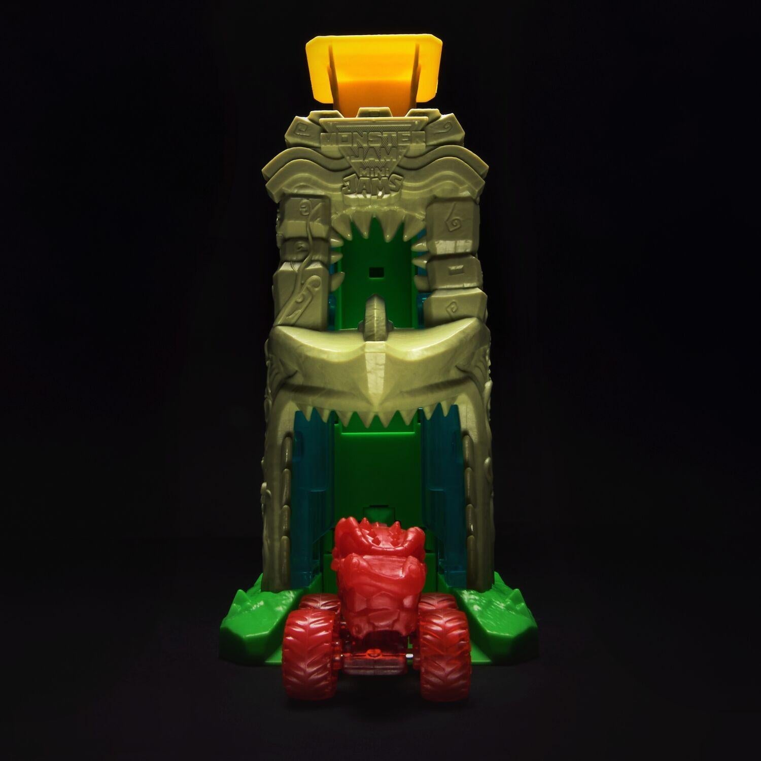 Get lost in the jungle with the Monster Jam, Megalodon Jungle Blaster playset. Launch into action with 2 exclusive Mini Jam trucks, Megalodon and gem-themed ThunderROARus. This over 7-inch-tall launcher delivers endless excitement as you load up to 5 trucks and press to launch rapid fire action (additional trucks sold separately). Use the obstacle cargo box as target practice to keep your Mini Jams at bay.The Megalodon Jungle Blaster doubles as storage to keep your mini trucks tidy and ready for play. With so many other Monster Jams trucks to collect, add Grave Digger, Max-D, El Toro Loco and more (each sold separately) to your collection and race them all! Monster Jam toys like remote control cars and more to bring the excitement home. Bring the action with the Monster Jam Cobras Crazy Escape playset.*Features:** 7-Inch Launcher: Load up to 5 Monster Jam Mini Jams into the top of the launcher and slam the launcher hammer consecutively for rapid fire fun* Includes 2 Exclusive Mini Jams: This set features collectible 1:87 scale versions of Megalodon decked out with eye-catching details and a unique gem-inspired ThunderROARus* Cargo Box Accessory – Ready, aim, launch; use the cargo box as a stunt target and watch as your trucks crash, and smash* Includes: 1 Launcher, 2 Mini Jam Trucks, 1 Cargo Box* Suitable for ages 3+