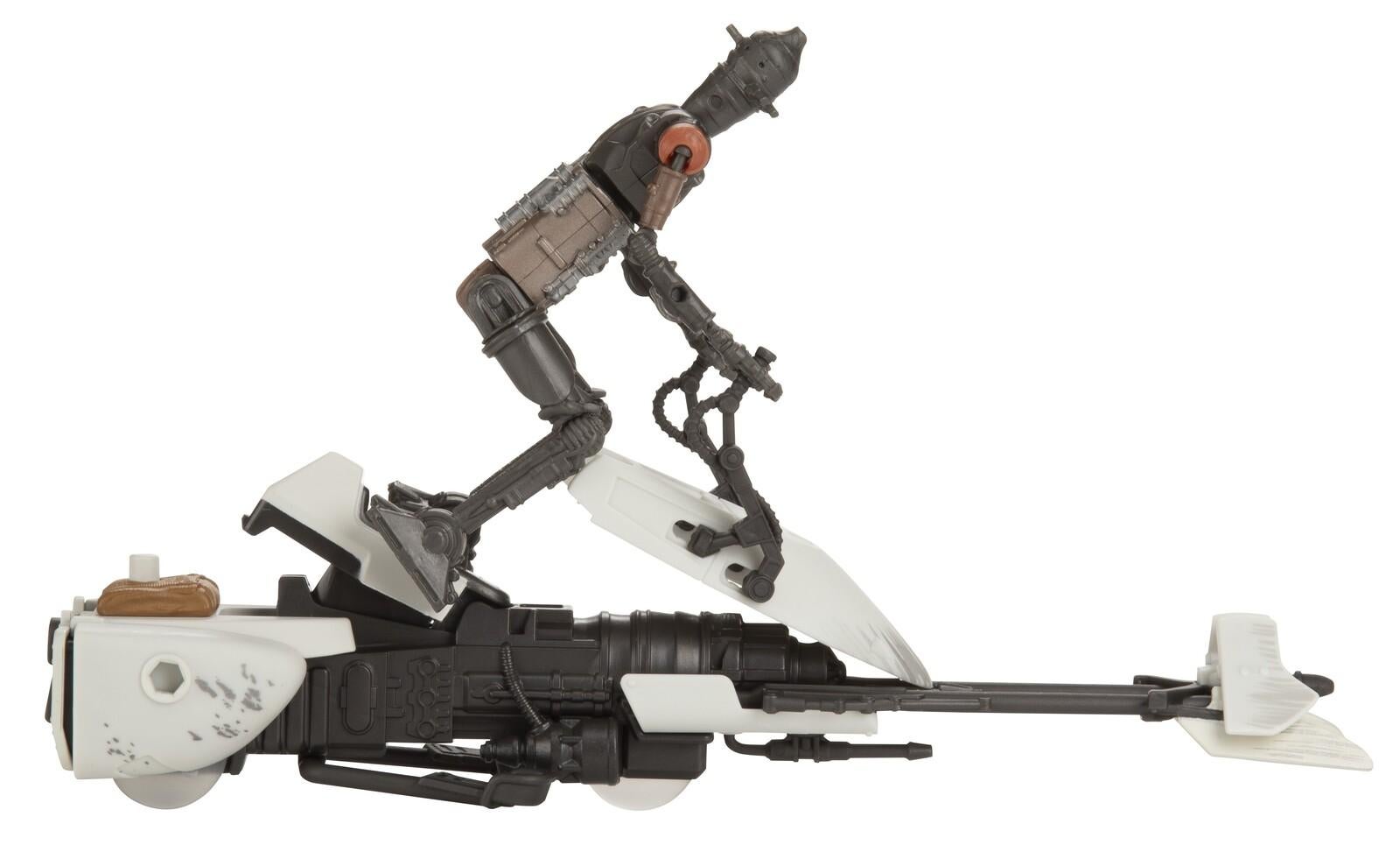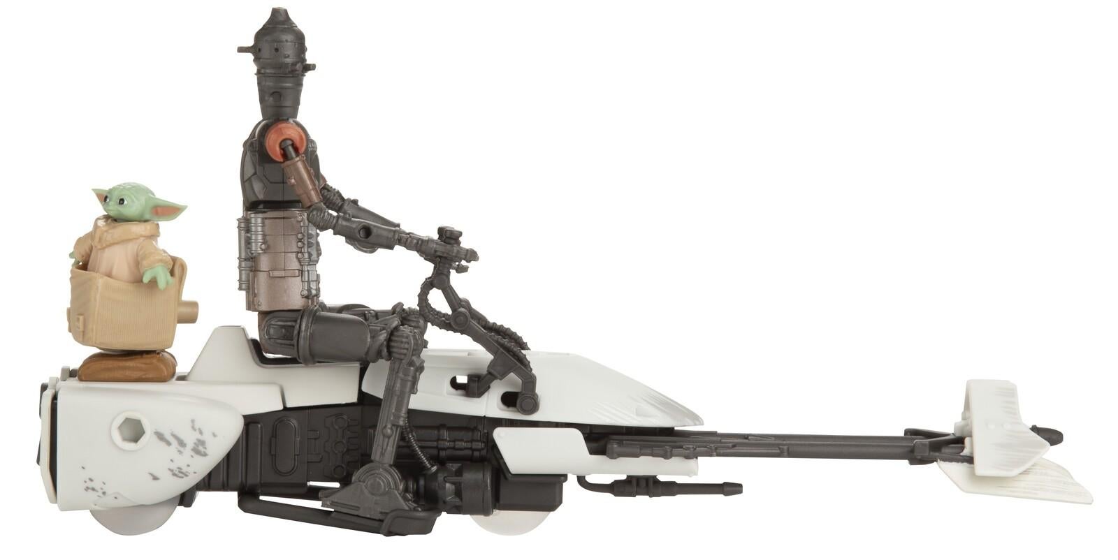 Reimagine an iconic scene from The Mandalorian live-action series with the Star Wars Epic World of Action IG-11 & Grogu Speeder Bike. The IG-11 action figure easily fits on the included speeder bike, featuring adjustable handlebars and footholds, plus Grogu has his own seat in the back. Kids will love the vehicle’s crash and eject feature, which launches IG-11 from the bike on impact. Standing around 5 inches tall (12.5 cm) and featuring 9 points of articulation, this action figure for kids is the perfect addition to your little fan's collection. Look for even more figures and vehicles to collect across Hasbro's Epic World of Action, featuring kid-favorite characters and entertainment-inspired design.*Features:** *STAR WARS ACTION FIGURES:* This Star Wars toy includes a 5-inch (12.5 cm) IG-11 action figure and a 1-inch (2.5 cm) Grogu figure, featuring design and detail inspired by their characters from The Mandalorian live-action series on Disney+* *ICONIC STAR WARS VEHICLE:* This Star Wars speeder bike has wheels for maximum speed, features adjustable handlebars and footholds, and comes with a seat for Grogu* *CRASH & EJECT FEATURE:* When the speeder bike makes impact with an obstacle, IG-11 is ejected from the bike. Reset to crash again and again!* *LAUNCH A PROJECTILE:* Load the included projectile into the launcher, attach it to the side of the speeder bike, and press the button to fire* *POSEABLE PLAY:* The IG-11 figure features 9 points of articulation, so kids can easily seat him on the bike. Fit the 2 included weapon accessories into his hands, or have him grip the handlebars to keep him in place* *COMPATIBLE ACROSS EPIC WORLD OF ACTION:* This Star Wars set is compatible with most vehicles, accessories, and other figures in Hasbro's exclusive Epic World of Action. (Each sold separately. Subject to availability)* *STAR WARS GIFTS FOR KIDS:* Look for other Star Wars toys to collect or give as gifts for 4 year old boys and girls – featuring figures inspired by the Mandalorian, Darth Vader, a stormtrooper, and more*Includes:** 2× figures* vehicle* 4× accessories_Ages 4 and up_*WARNING* – _Small parts_