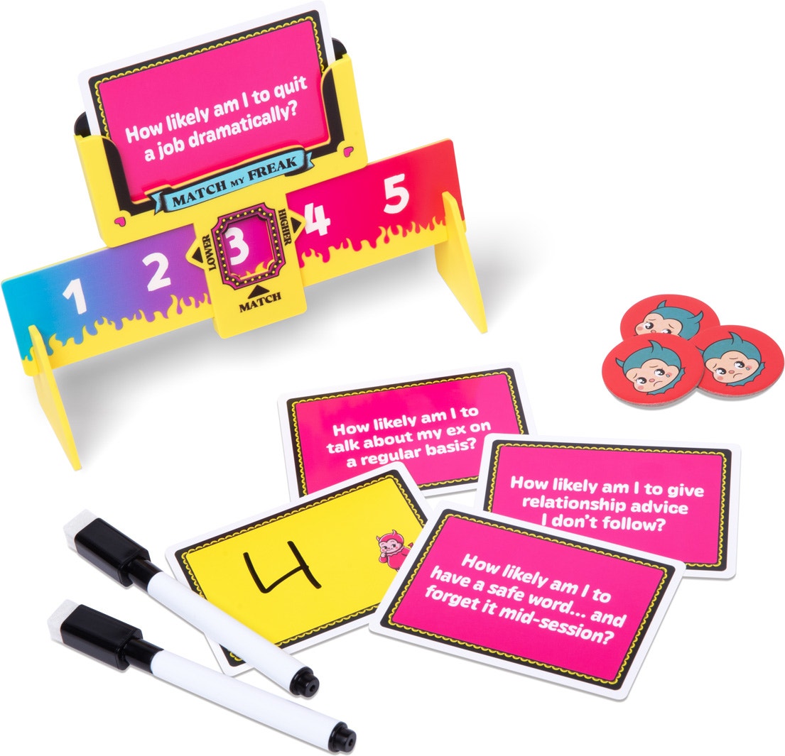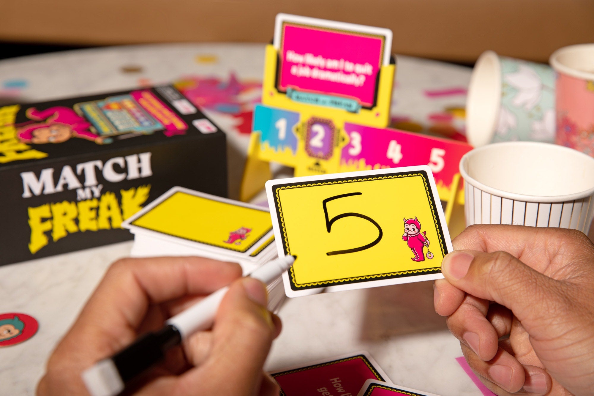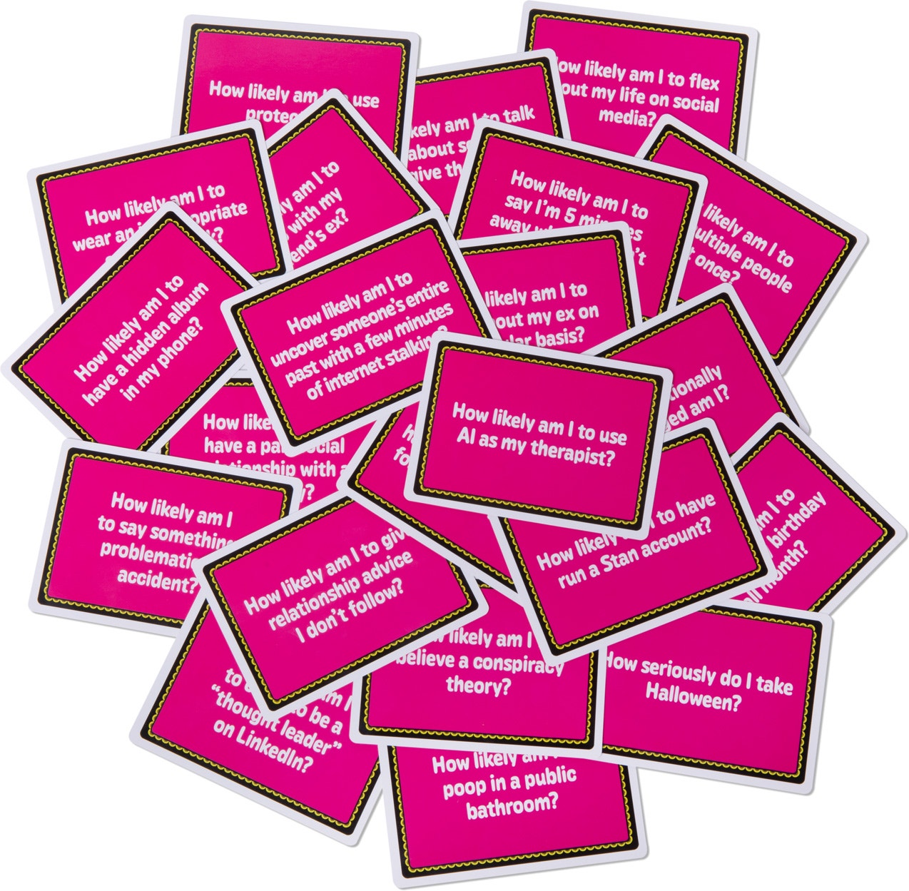 Draw a Question Card (e.g., "How likely am I to flirt with a stranger?") and secretly rate yourself on a scale of 1-10 (e.g., 6). The group is given a baseline number (e.g., 5) and debates whether your answer is higher or lower. Once they decide, flip your card to reveal your answer!