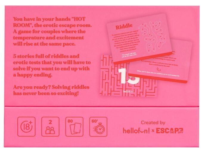 Are you ready? Solving riddles has never been so exciting!You have in your hands “HOT ROOM”, the erotic escape room. A game for couples where the temperature and excitement will rise at the same pace.5 stories full of riddles and erotic tests that you will have to solve if you want to end up with a happy ending.*Features:** Players: 2* Playtime: 60 Minutes* Ages: 18+*Contents:** 80× Cards* Instruction Card