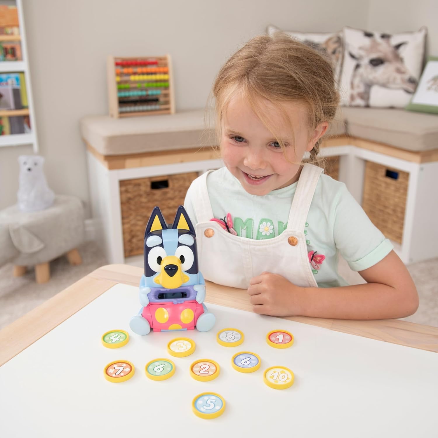 The Save with Bluey toy is shaped just like Bluey from the show and it includes 10 numbered coins.
