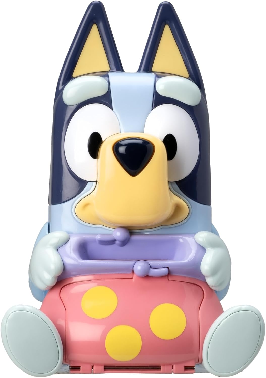 Insert coins to hear different sounds effects and character sounds. Simply open the purse to retreive the coins and start all over again! Press Bluey's nose to hear the Bluey theme tune.