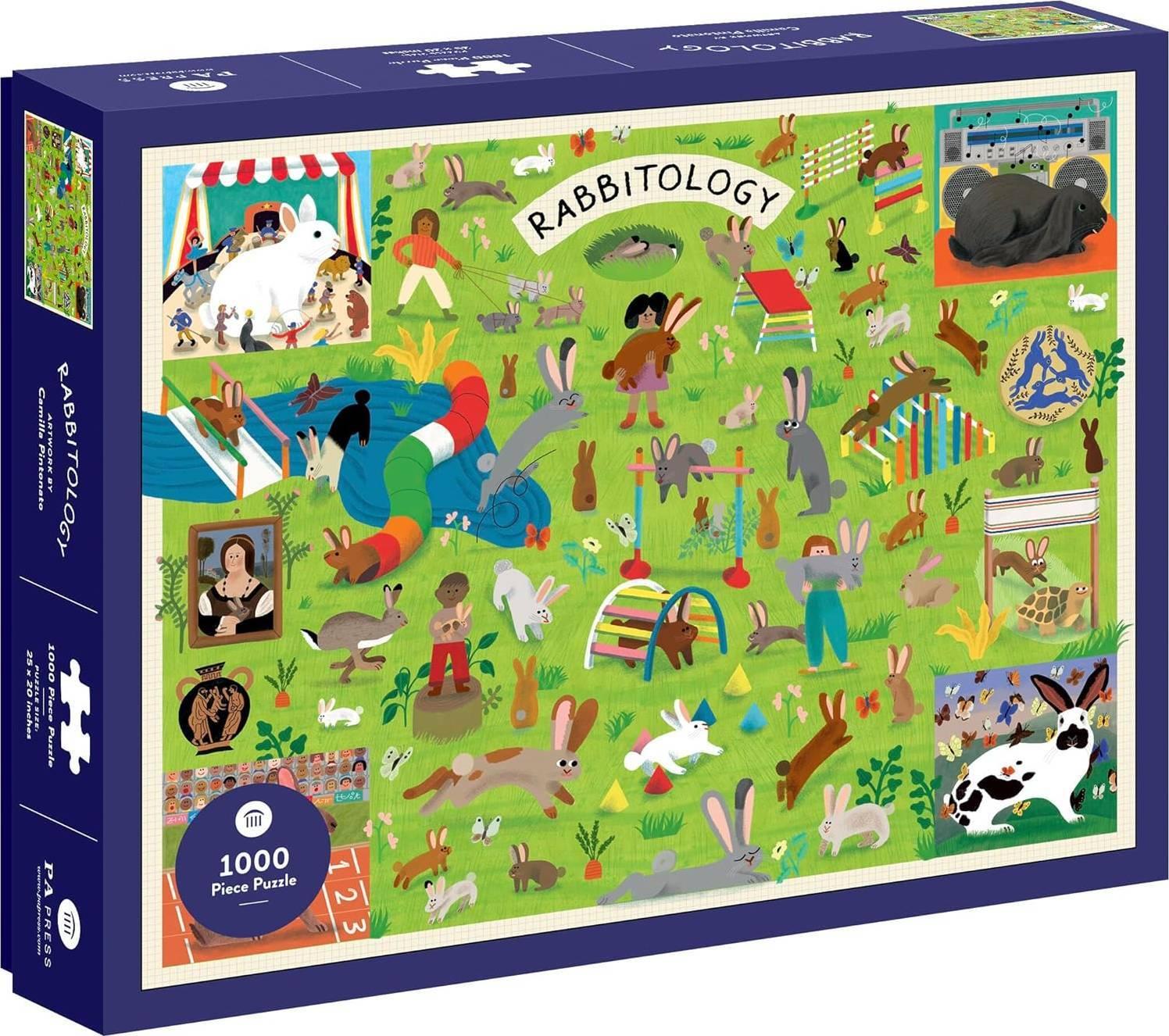 Whether raised as pets or roaming in nature, gentle and affectionate rabbits are beloved by all. Ideal for animal lovers, this puzzle is packed with rabbits of all kinds capering in a lush green space. Whether you need a break from screen time or are a true puzzle fanatic, you will love assembling these high-quality pieces and getting lost in the vibrant image illustrated by Camilla Pintonato, the talented artist whose work includes the Farm Animal book series: Rabbitology, Chickenology, Pigology, and Sheepology.Celebrate spring with this bright puzzle set in a green meadow and filled with fun outdoor activities. Perfect for adding to Easter baskets or gift-giving to curious grade schoolers, teachers, and families; animal and nature lovers; and artists who love to draw animals and farm scenes.*Features:** A delightfully illustrated 1,000-piece puzzle packed with rabbits of all kinds.* Pair this puzzle with Rabbitology, a visual encyclopedia filled with intriguing and engaging facts about the lovable bunny, that is part of the charming and educational Farm Animal series, which also includes Chickenology, Pigology, and Sheepology.* Camilla Pintonato’s whimsical art makes this giftable rabbit puzzle fun to give and receive.* Family members of all ages can build this puzzle together and learn something new from observing rabbits’ distinctive characteristics.* 1000 high-quality pieces and minimal puzzle dust, assembling to 25 × 20 inches. Also included is an insert of the puzzle image and accompanying artist statement.