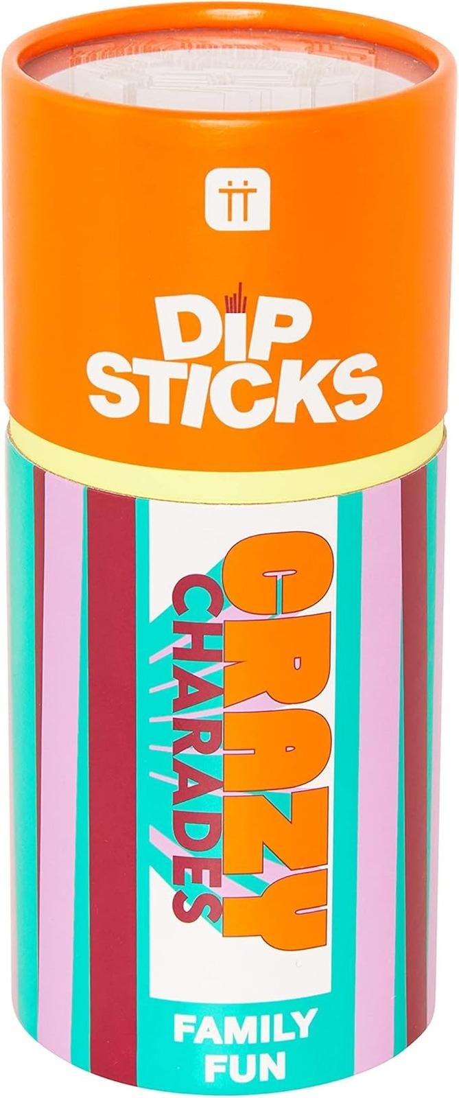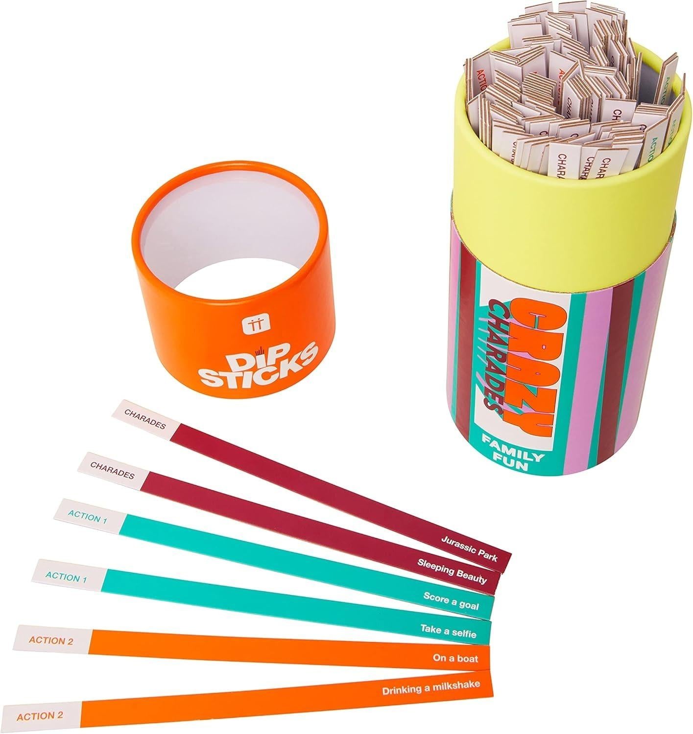 The Dipsticks Crazy Charades Game by Talking Tables. Dip in, pick a stick and let the fun begin in this dramatic game of two halves!Brush up on your acting skills as you mime your way through one of the two included fast-paced acting games; charades and act it. Be the first person to guess correctly to win a stick. The person with the most sticks wins! The perfect game to play with family and friends. Contains 160 double sided sticks*Features:** 2+ Players* Ages 7+