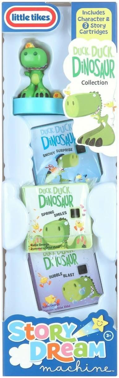 Harper Collins Duck, Duck, Dinosaur Collection for the Little Tikes Story Dream Machine includes three stories and one Spike character that adds light effects in nightlight mode.The Story Dream Machine develops beginning reading skills as children see and hear words and can read along with the narrator as the words and images shine brightly on the wall. Kids will be delighted as they watch colorful lights and listen to sound effects.The always expanding library of story collections offers a great variety to choose from and can be purchased separately. Stay tuned for new content.*Features:** Includes 3 stories and 1 character that adds light effects in nightlight mode.* Use with the Story Dream Machine to watch, listen, and read along to stories as they shine bright on the wall.* Develops beginning reading skills and word recognition as children see words projected and hear a narrator read them a story.* Grow your library with additional story collections (each sold separately).* Check back for the launch of new stories and content.*Suitable for Ages 3+*