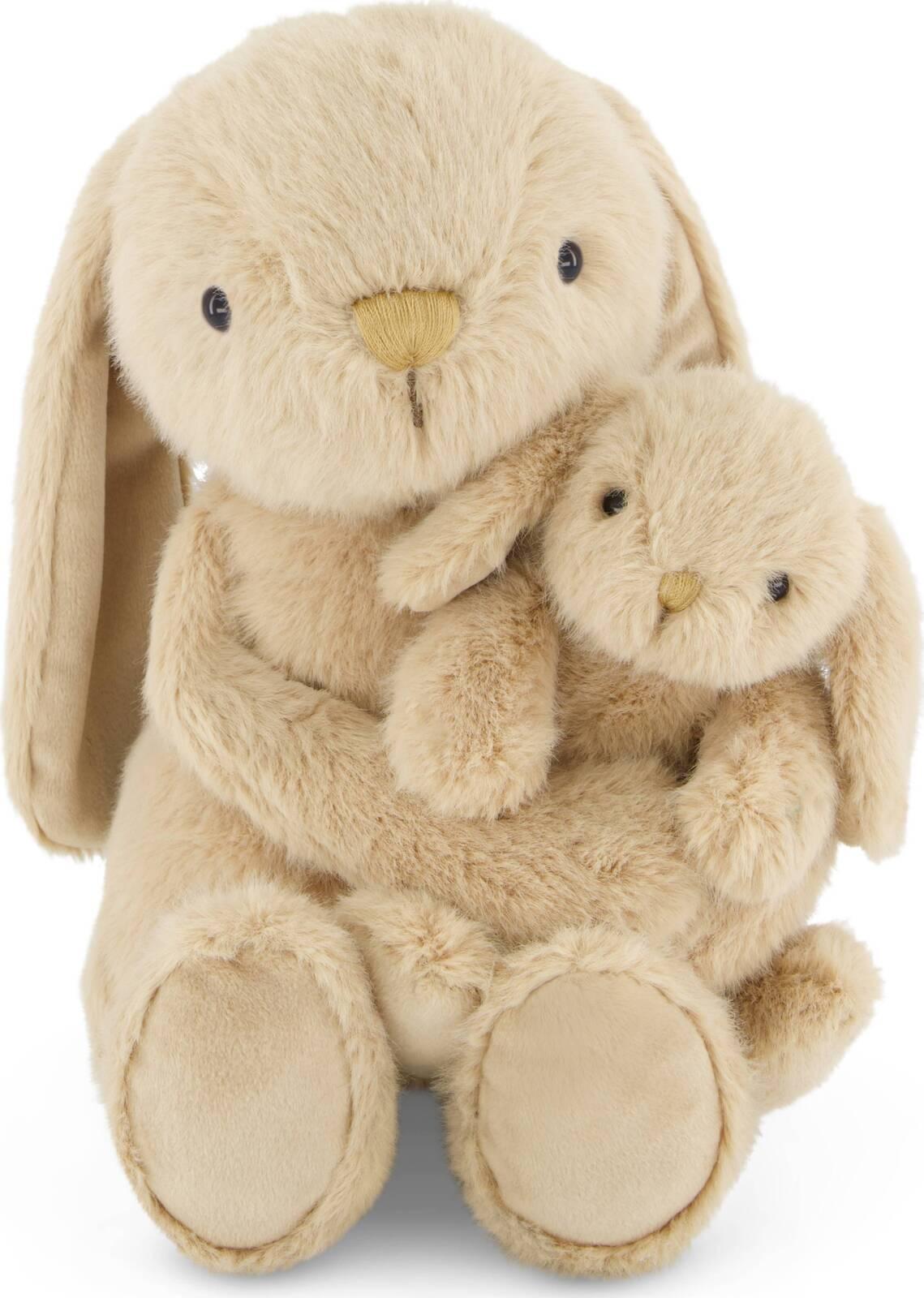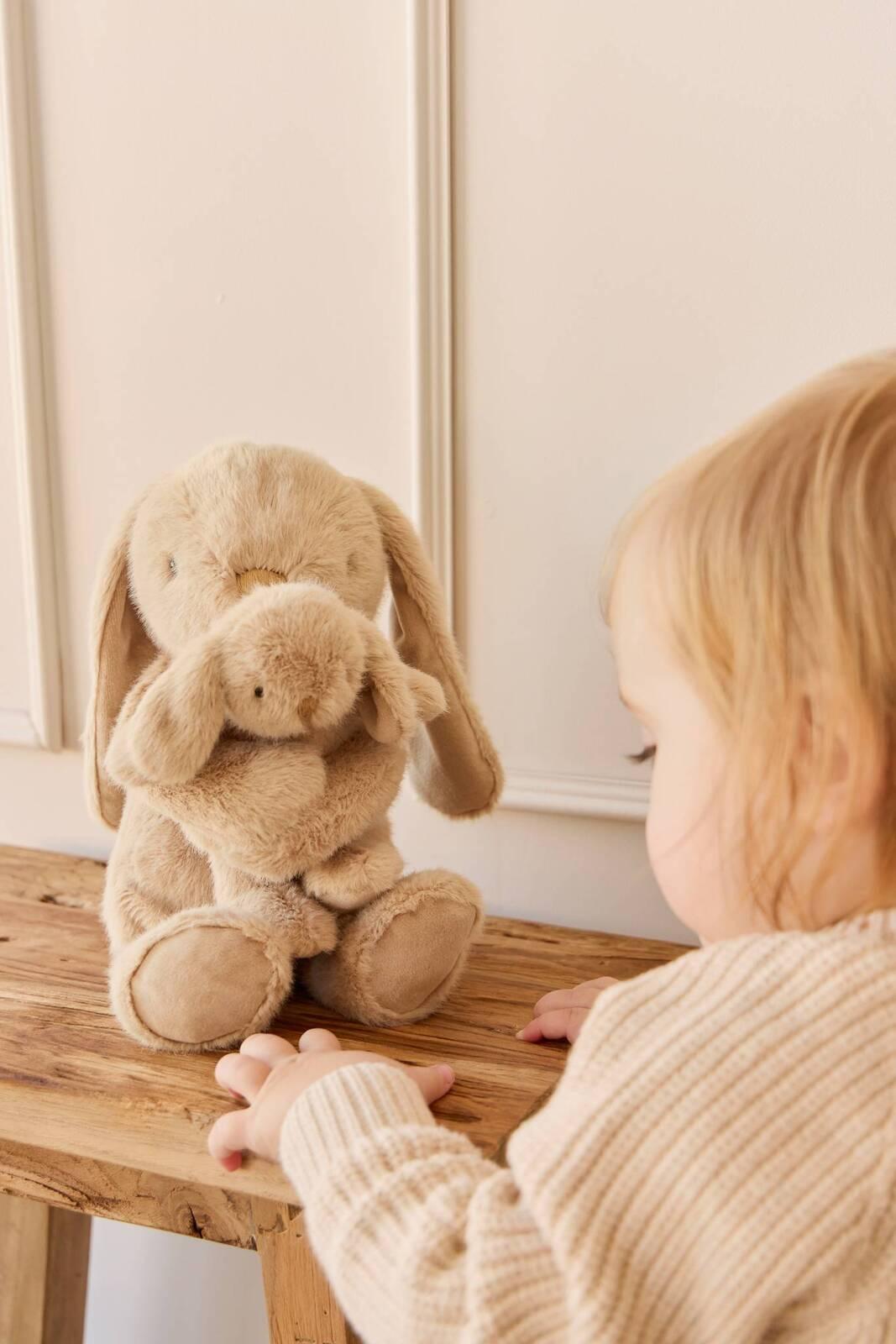 *Frankie the Hugging Bunny loves gardening in the sunshine, playing peekaboo, and most of all, cuddling Baby Bunny close. She dislikes being away from family, always keeping her little one near!*The perfect gift for your little ones to snuggle up with and love. Frankie is a 30cm mama bunny and comes together with her cutie 15cm baby. Our mama bunny's hands feature Velcro fastening so they can be separated to let baby free for play time, or kept together to hold their little darling close.Crafted from the softest materials, our Snuggle Bunnies are the perfect companions for your child. Their unique design and colors are sure to capture your child's imagination and spark their curiosity. Plus, their soft and cuddly texture is sure to provide your child with hours of comfort and joy.Our Snuggle Bunnies make the perfect gift for birthdays, holidays, or just because. Whether your child is a bunny lover or looking for a new snuggly companion, these toys are sure to be a hit.
