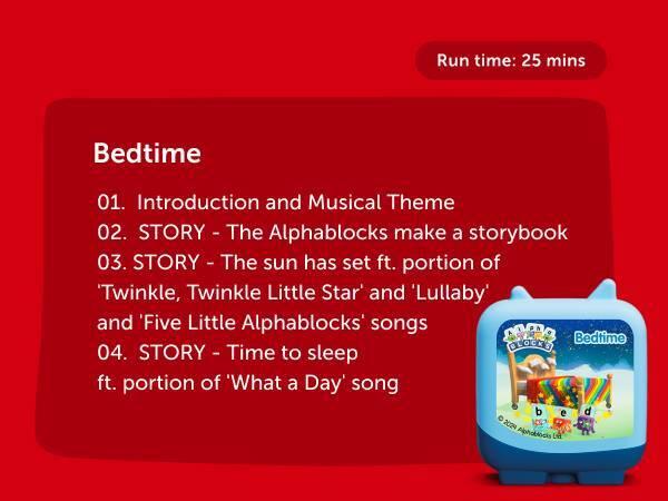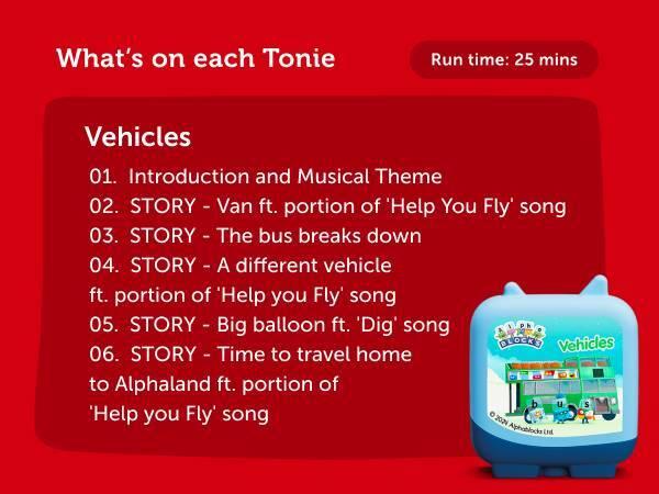 *tonies: Alphablocks – Alphablocks Clever Pocket Tonie*Ready for some fun with the Alphablocks? This is phonics made supersonic – All a little learnerneeds to do to join this letter-loving Alphaland crew, is pop one of these Clever Pocket Tonies on top of a Toniebox!Starring CBeebies favourite Alphablocks, and featuring some ‘a-mazing’ new magical adventures, this set of four Clever Pocket Tonies helps little ears recognise their letter sounds, master words and get the very best start on their learning journey. The show’s winning blend of fantastic stories, catchy songs and silly fun is the perfect way to introduce early years phonics sounds.*This Tonie teaches:** Phonics* New words* Sentence construction*Tracklist:*ALPHABLOCKS ADVENTURESVehicles1. Introduction and Musical Theme2. STORY – Van ft. portion of ‘Help You Fly’ song3. STORY – The bus breaks down4. STORY – A different vehicle ft. portion of ‘Help you Fly’ song5. STORY – Big balloon ft. ‘Dig’ song6. STORY – Time to travel home to Alphaland ft. portion of ‘Help you Fly’ songAnimal friends1. Introduction and Musical Theme2. STORY – The singalong starts3. STORY – At the farm ft. portions of ‘Fox’, ‘Song’ and ‘Cat and Dog’ songs4. STORY – Back to AlphalandRhyme Time1. Introduction and Musical Theme2. STORY – The hill ft. portion of ‘Frog on a Dog’ song3. STORY – Back at the Big Blocks Box4. STORY – The chase!5. STORY – Back to AlphalandBedtime1. Introduction and Musical Theme2. STORY – The Alphablocks make a storybook3. STORY – The sun has set ft. portion of ‘Twinkle, Twinkle Little Star’ and ‘Lullaby’ and ‘Five Little Alphablocks’ songs4. STORY – Time to sleep ft. portion of ‘What a Day’ song*Details:** Tonies only work when paired with a Toniebox* Running time: 100 minutes (25 minutes per set)* Suitable for: 3+* Pack of 4 Clever Tonies