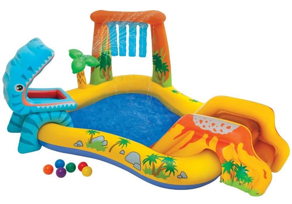 *Intex: Dinosaur Play Centre*Slide down the volcano and splash into the pool to feed the hungry dinosaur with colourful fun balls. Attach a garden hose to keep kids cool with the palm tree sprayer and waterfall.* Dimensions: 2.49m x 1.91m x 1.09m.* Slide down the volcano and splash into the pool to feed the hungry dinosaur with colourful fun ballz (6 balls included).* Attach a garden hose to keep the kids cool with the palm tree sprayer and waterfall.* Water flow to palm tree sprayer and waterfall adjusts with control valve.* Landing mat for extra padding.* Drain plug in pool floor.* Repair patch Included.* 81kg maximum weight limit.*Suitable for ages 2 & up**WARNING*_Due to their lightweight nature, inflatable devices designed for home use may pose a serious risk of injury if not used properly or in bad weather conditions_._Children, especially children under five years, are at high risk of drowning._ *_Constant parental supervision is required at all times._*---* Please follow all operating rules whenever this product is in use* Tether or anchor the inflatable device to an appropriate surface* Diving or jumping may result in serious injury* Do not use the inflatable device in bad weather conditions* Empty pool or prevent access when not in use* This is not a flotation device _Intex Recreation Corp distributes airbeds, above-ground pools, spas, toys, furniture, boats and more. They routinely test finished products to make sure they meet their elevated standards for quality, safety and value._