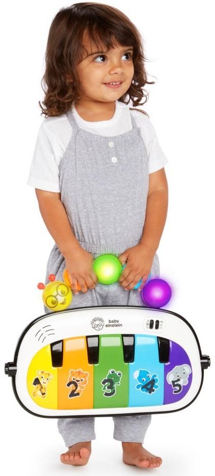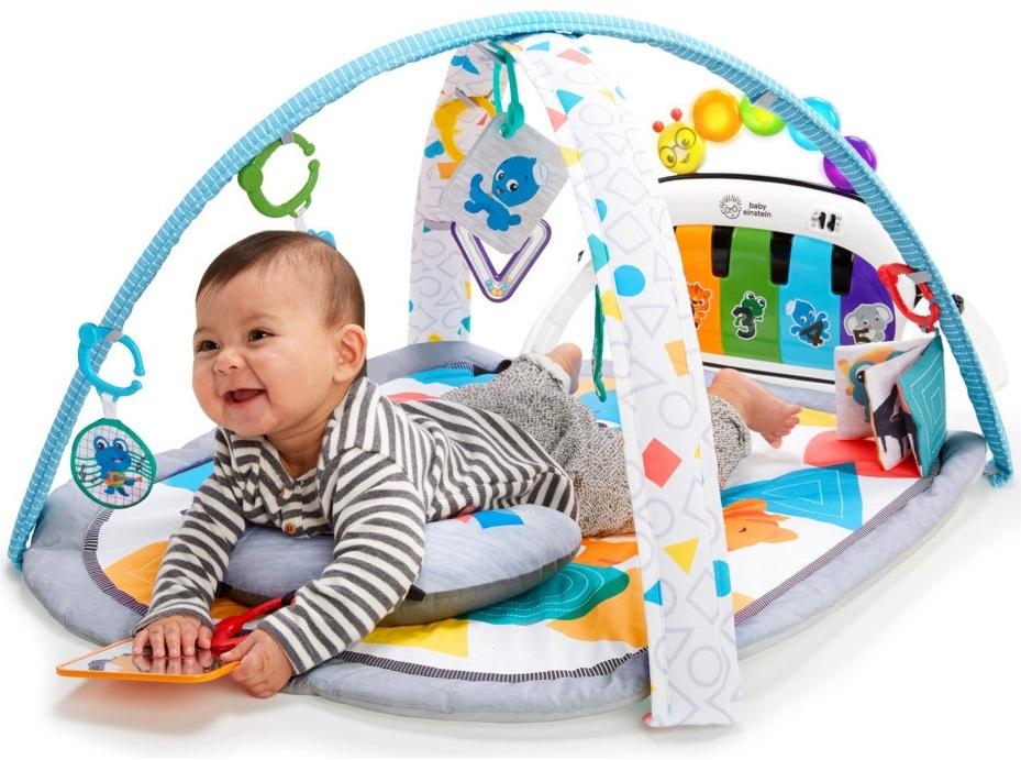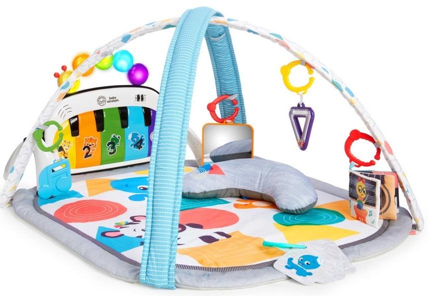 *Baby Einstein: 4-in-1 Kickin' Tunes Music and Language Discovery Activity Play Gym*Orchestrate the perfect playtime for baby with the 4-in-1 Kickin' Tunes™ Music and Language Discovery Gym. Your baby’s musical genius will stretch from her head to her toes when it comes to this play gym. Thanks to Magic Touch technology, she can play the piano with just a press of her finger or the kick of her foot!*Features:** The included prop pillow helps make tummy time a more comfortable and enjoyable experience while your baby takes in the world around her.* Using all her senses, she’ll explore seven interesting toys and more than 70 melodies, sounds and phrases in 3 languages.* The discovery is nearly endless with toys in all directions – including a crinkle medallion, triangle rattle, textured music note, flash cards and self-discovery mirror.* This multi-sensory gym is made to grow with your baby’s development.* From tummy time to sit and play, Baby Einstein is sure to inspire your baby’s curiosity.* Recommended for ages 0+ months* Product Dimensions: 864 × 686 × 457mm