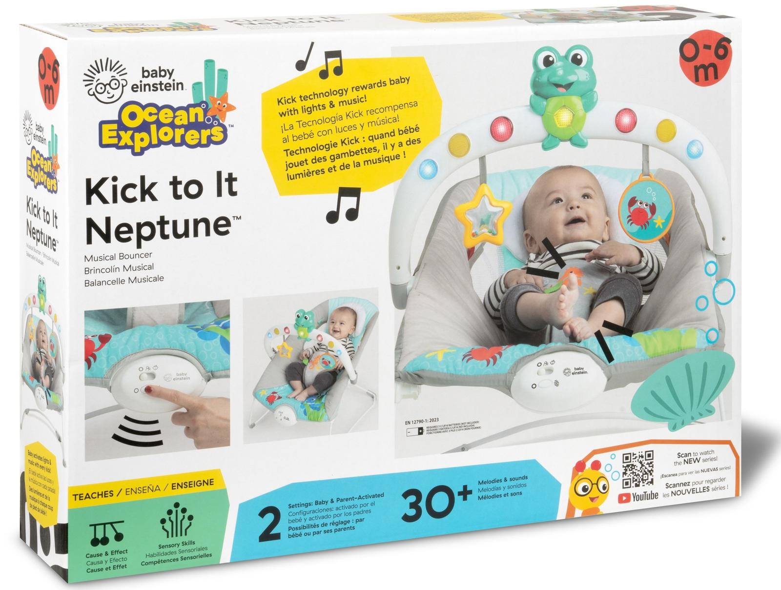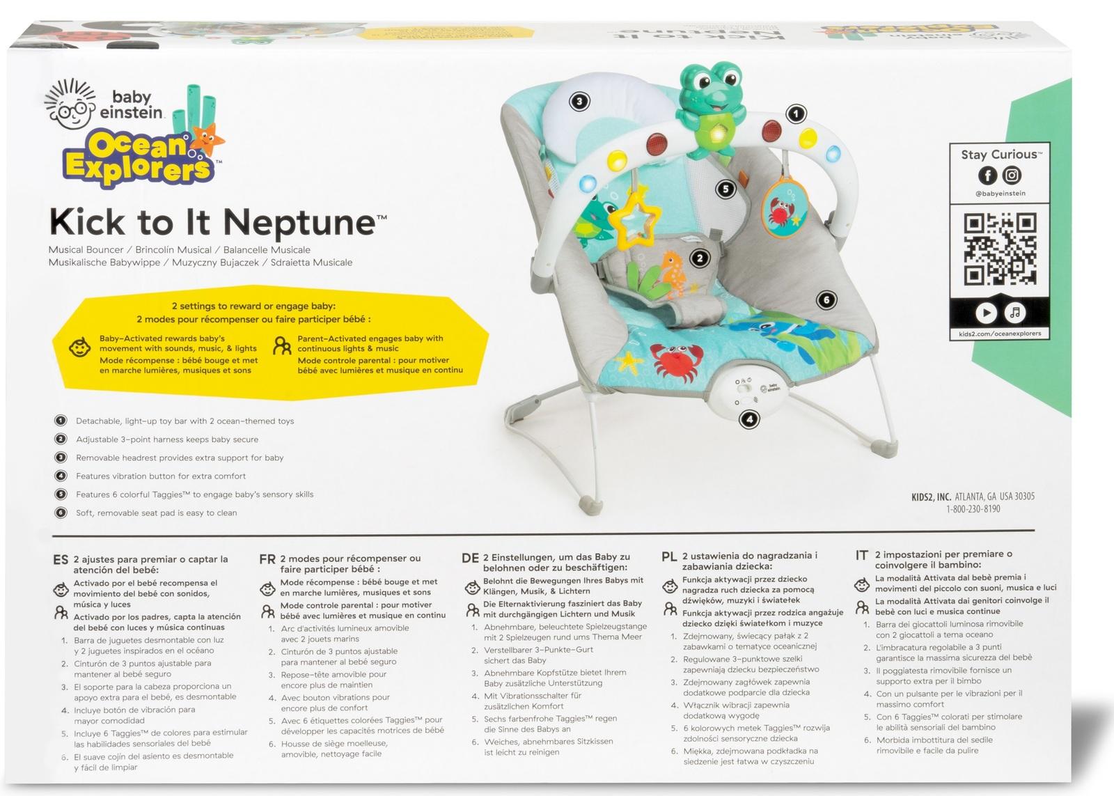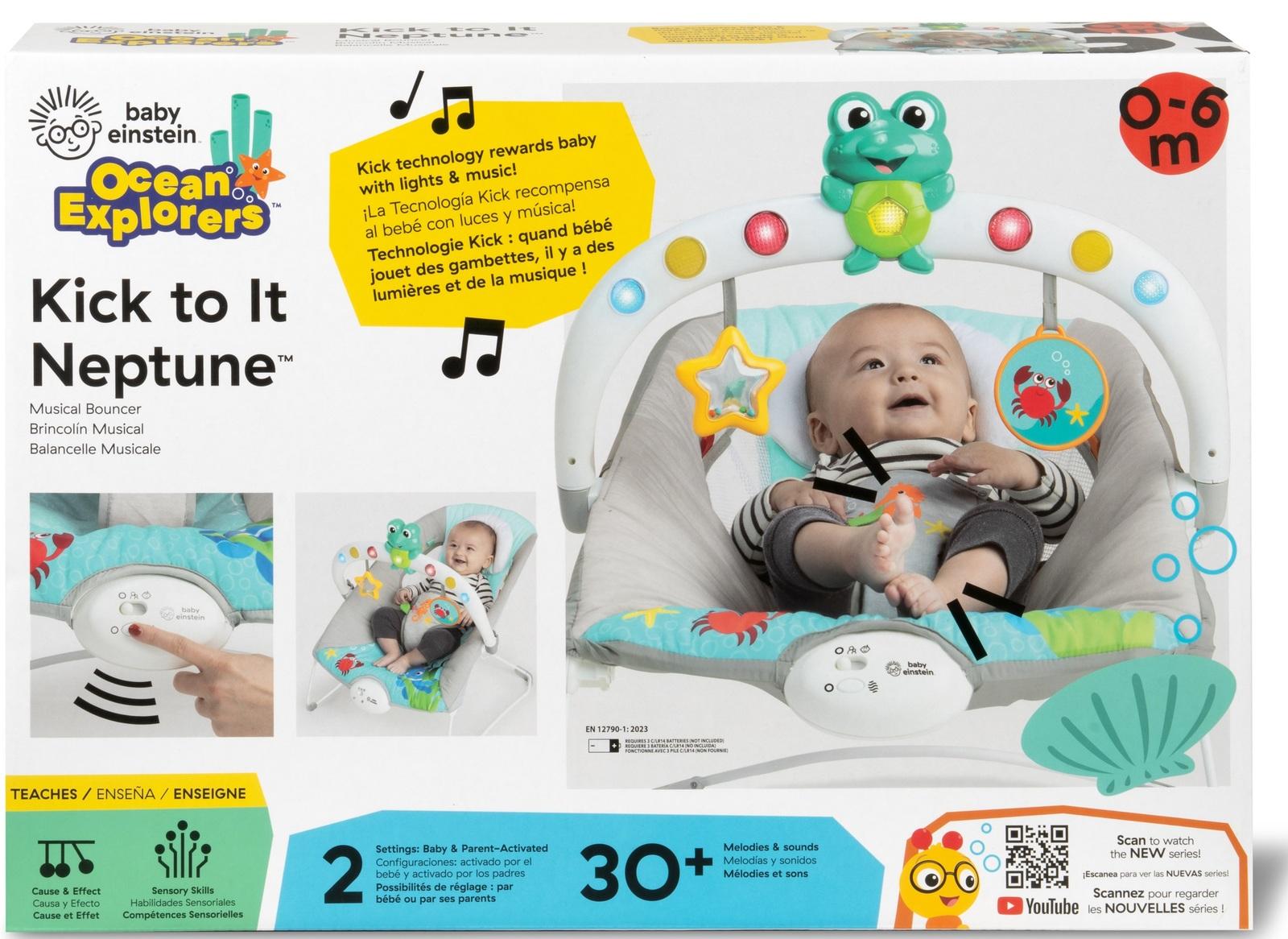 *_Baby Einstein: Ocean Explorers Kick to It Neptune Musical Bouncer_*The Baby Einstein Ocean Explorers Kick to It Neptune Musical Bouncer rewards baby’s movements and exploration with lights, music, and ocean sounds. In Baby-Activated Mode, baby’s kicks trigger lights and music to engage and support cause-and-effect learning.*Features:** Parent-Activated Mode plays 15 continuous classical and Baby Einstein Ocean Explorers melodies.* Crab toy with baby safe mirror, starfish rattle, and 6 Taggies encourage motor skill development while promoting self-discovery.* Removable headrest included for extra support. 3-point harness keeps baby secure.* Removeable seat pad cleans easily.* For use by children up to 20 pounds.* Assembled dimensions: 26.2 × 20.6 × 24.1 inches.* Requires 3 C batteries (not included)