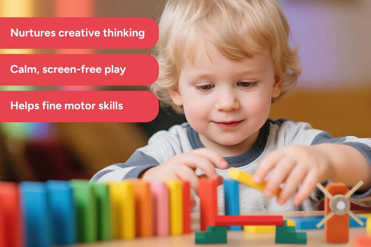 Build, stack and watch creativity come to life with this 1,000-piece wooden dominoes set. Packed with colour, motion and endless possibilities, it encourages fine motor skills, concentration and hours of imaginative play.* 1000-piece domino kit. Hours of tumbling, creative fun and learning in every set.* 12 bright colours. Supports colour recognition and pattern building.* Classic chain-reaction play. Boosts patience, planning and cause-effect learning.* High-quality pine wood. Smooth edges and water-based paint for safe play.* Comes with 3 storage bags. Easy to pack away and keep tidy after play.* Bonus obstacles and add-ons. Bridges, bells and spinners for action-packed fun.* Recommended for ages 3+. Perfect for preschoolers and early learners.* *Spark creativity through play*More than just knocking pieces down, this domino set invites kids to plan, test and build endless chain reactions. From bridges to spinners and bells, the set includes a variety of obstacles to bring their imaginative creations to life.* *Supports fine motor skills and focus*Lining up each domino takes patience and control – perfect for developing your child’s concen­tration, dexterity and hand-eye coordination in a screen-free, hands-on way.* *Colourful, high-quality and safe*Made from durable pine wood and finished with eco-friendly, water-based paint, each piece is finely polished with smooth edges, so it’s safe for little hands and built to last for years of creative play.*Specifications** Dimensions: 44 × 7 × 20mm (each)* Weight: 3.2kg* Colour: Multicolour* Features: Eco-friendly & Water-based paint* Material: Pine wood* Number of Pieces: 1000 Pieces* Set Includes: 13 blocks tools & 3 storage bags* Type: Dominoes Set* Age: 3+ years* Manufacturer Warranty: 1 Year*What's Included** 1000 x Kids Wooden Dominoes Set* 13 x Blocks Tools* 3 x Storage Bag* 1 x User Manual