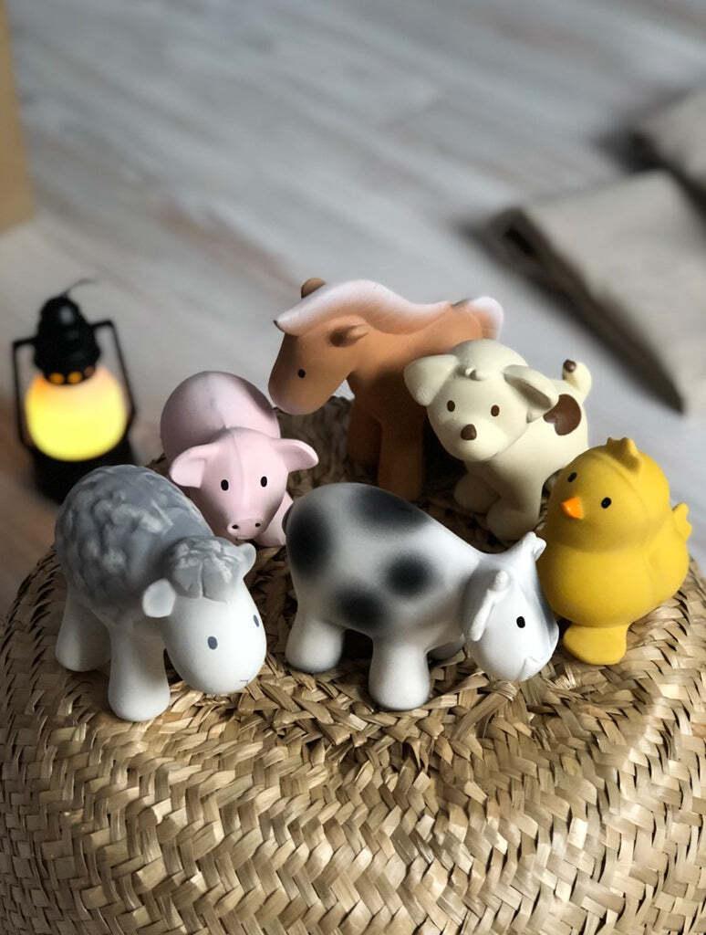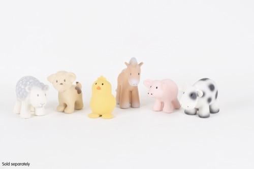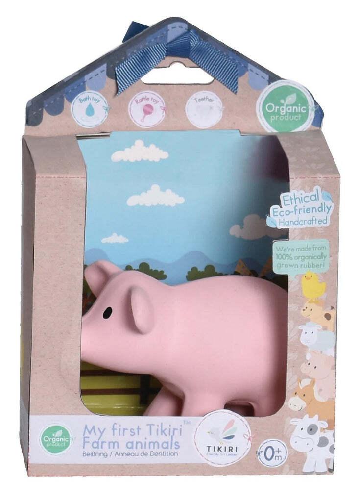 *_Tikiri: My First Farm Teether and Rattle Toy – Pig_*Made from organic natural rubber, this little piggy from our My First Farm Collection is easy for tiny hands to grip. And when shaken, it responds with a gentle sound that is sure to comfort your little ones.*Features:** Each farm animal character has an enclosed rattle that creates a soft sound when shaken. Sound toys, like rattles, provide stimulation to babies as they discover their senses. By creating sound, your child starts to learn fundamental lessons in cause-and-effect relationships.* These farm animals make a fantastic addition to bath time or water play, fully sealed for hygiene.* Baby toy age recommendation: 0+ months.* Size: 8.128 cm.* 100% pure natural rubber teething toy.* Safe, non-toxic chewable baby toy.* Certified plastic-free baby toy – BPA-free, Phthalate-free & PVC free.* Sustainable toys which are biodegradable.