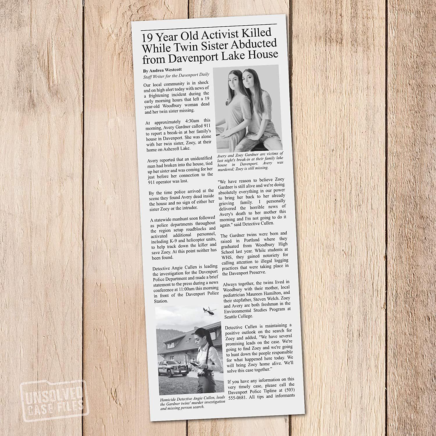 _DAVENPORT, OR – At 4:23 this morning, a man broke into a remote lake house where 19 year-old twins Avery and Zoey Gardner were asleep. The unidentified man murdered Avery and abducted Zoey before first responders could arrive.__Police departments across two states are hunting for Avery’s killer and her twin sister Zoey, but neither has been found.__Homicide detective, Angie Cullen, made a breakthrough in the case but then mysteriously disappeared. She left her detective’s notebook behind but authorities aren’t sure what to make of it.__The killer is on the loose. Can you solve the case and get to Zoey, and also find the detective, before it’s too late?_Solve the 3 objectives to determine who is innocent and who is guilty.Look through all evidence, except the bonus envelopes. Go to the website located on the inside front panel of the folder to determine your first objective.After reading the case, players will solve 3 objectives to move through the case. Solutions to objectives can be checked on the online answer key. Players will be given more evidence online after solving each objective. If you are stuck the online answer key can also offer hints. Once players feel they know who did it based on the evidence they check their solution on the online answer key.Once all three objectives have been solved and you have the evidence to convict the killer, you’ve won!