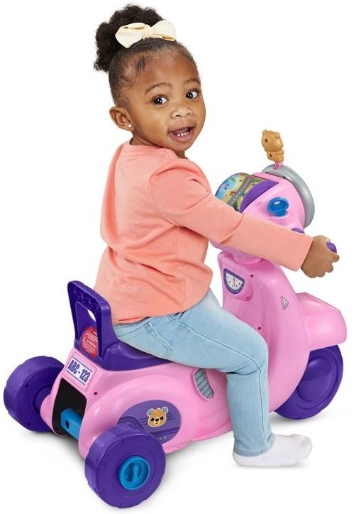 *_Vtech: 2-In-1 Ride & Balance Scooter – Pink_*2-in-1 grow-with-me transforming ride-on toy! Switch from trike to scooter as little ones gain confidence in balance and coordination Turn the key to start the engine, explore locations on the roller map and twist the outer headlight ring to fuel imaginative play Use the dashboard buttons to introduce counting, traffic and road safety phrases, as well as enjoy catchy songs and melodies Motion-activated motor sounds shift travel adventures into high gear as they roll around town Intended for ages 12–36 months; 42 pounds max; requires 2 AA batteries; batteries included for demo purposes only; new batteries recommended for regular use This 2-in-1 unisex transforming motorbike toy is great for toddlers to travel around on exciting adventures; makes a cute kid gift for holidays, birthdays, important milestones, or just because!*Features:** 2-in-1 grow-with-me transforming ride-on toy! Switch from trike to scooter as little ones gain confidence in balance and coordination* Turn the key to start the engine, explore locations on the roller map and twist the outer headlight ring to fuel imaginative play* Use the dashboard buttons to introduce counting, traffic and road safety phrases, as well as enjoy catchy songs and melodies* Motion-activated motor sounds shift travel adventures into high gear as they roll around town* Intended for ages 12–36 months; 42 pounds max; requires 2 AA batteries; batteries included for demo purposes only; new batteries recommended for regular use* This 2-in-1 unisex transforming motorbike toy is great for toddlers to travel around on exciting adventures; makes a cute kid gift for holidays, birthdays, important milestones, or just because!
