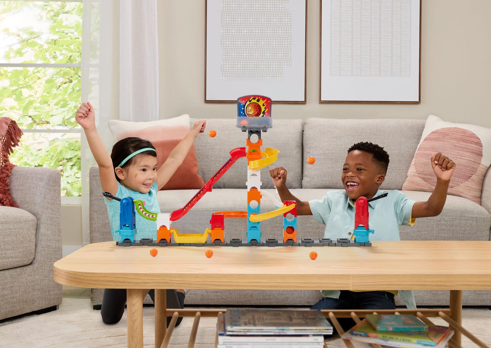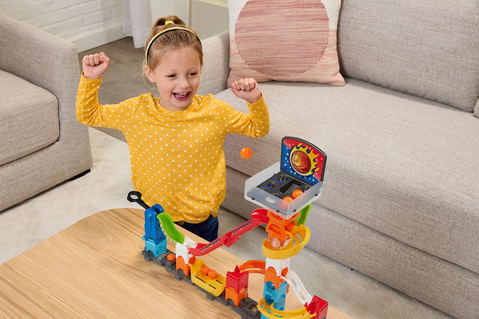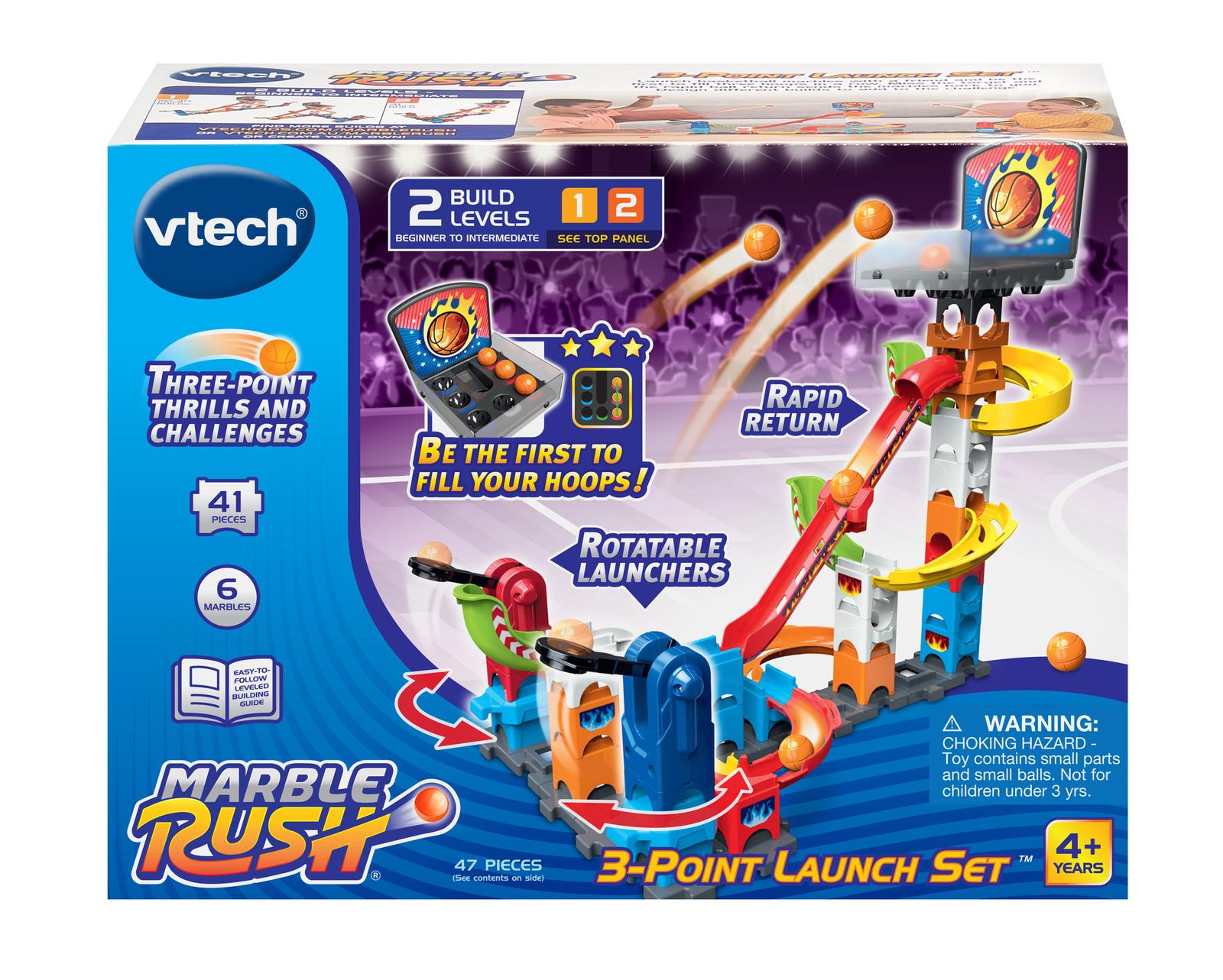 Launch three-point shots in a head-to-head basketball challenge! Create three buzzer-beating builds using the easy-to-follow levelled guide by connecting the 41 colour-coded pieces including two rotatable launchers, basketball hoop and exciting tracks! Create your own courses to explore STEAM (Science, Technology, Engineering, Art and Maths) skills.When the gravity-fed course is complete, start the competition by taking turns launching the six marbles towards the basketball hoop. Fill three rings in a row to win a game of tic-tac-free-throw. The hoop also has a rapid return that sends marbles speeding through the course. Combine with other Marble Rush sets (each sold separately) to create an extreme playset.*Features:** Easily connect the basketball hoop with rapid marble return, two rotatable launchers and winding tracks; this 47-piece set includes six basketball marbles* Construct three different builds using colour-coded blocks and the easy-to-follow guide or create your own build to explore STEAM skills* Compete with family and friends to take shots for a tic-tac-free-throw game or move the launchers around to play a game of Horse* Suitable for ages 4+ years