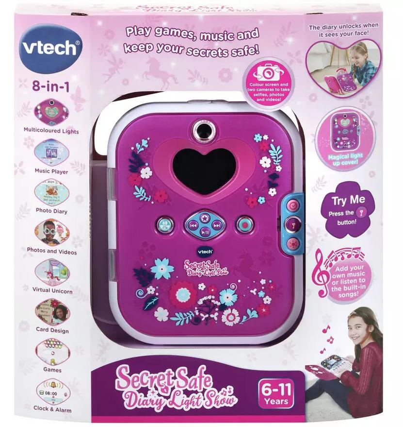 *Vtech: Secret Safe – Diary Light Show*This beautifully designed diary has a large 2.4 colour screen. Unlock the diary using the amazing face recognition technology! Have fun with the light effect cover that synchronises with music. Add a number password for extra security! Take care of your very own virtual pet and play great learning activities that cover spelling, typing, maths, logic and more! Record voice memos and apply funny effects to them!*Features:** Encourages self-expression, creativity, journaling, photography, music and more.* Pop-open cover uses facial recognition to keep your memories safe.* Express yourself! Create a photo journal, write diary entries or even record messages.* 2.4 colour screen allows you to add in cool effects and filters to your pictures.* Dimensions: Size H30.5, W27.5, D5.8cm.* Batteries required: 4 x AA (included).*Suitable for ages 6 & up*