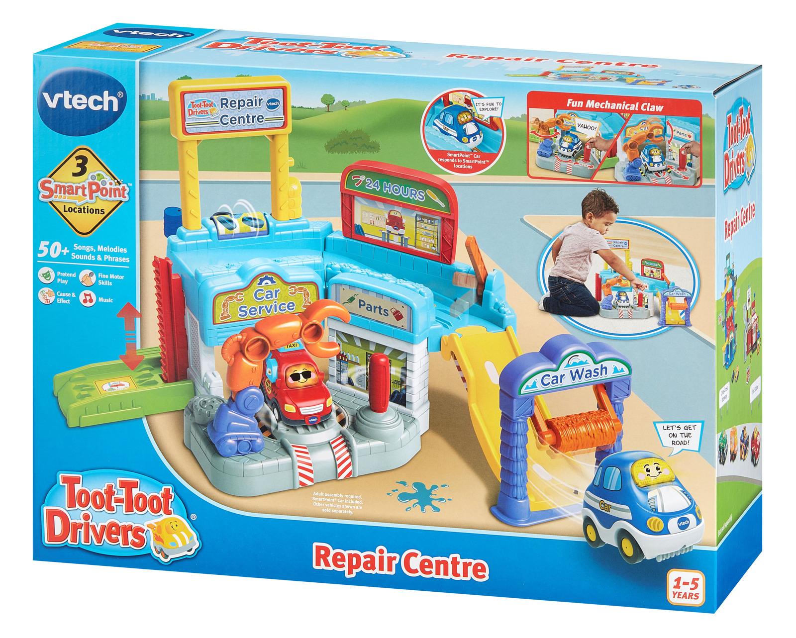 Zoom into the play zone with the Toot-Toot Drivers Repair Centre! Lift, fix and learn with this fun play set! Includes a repair base with cool moveable claw so you can move the included SmartPoint car around to ‘fix’ it.Car lift lets you move the car from floor to floor to reach the interactive tyre roller or to the role-play carwash. 3 SmartPoint locations add to the fun by triggering fun phrases, sounds and songs when driven over! You can also connect to other Toot-Toot Drivers play sets! (Each sold separately). Encourages language development, imaginative play and helps develop essential motor skills.*Features:** Zoom into the play zone with the Toot-Toot Drivers Repair Centre* Includes a repair base with cool moveable claw so you can move the included SmartPoint car around to ‘fix’ it* Car lift lets you move the car from floor to floor to reach the interactive tyre roller or to the role-play carwash* 3 SmartPoint™ locations add to the fun by triggering fun phrases, sounds and songs when driven over