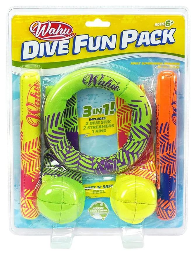 *Wahu – Dive Fun Pack*You’ll have hours of fun with The Big Fun Pack including Dive Stix, Dive Streamers and a Dive Ring. All covered in the soft Wahu neoprene material. Excellent for building underwater swimming skills and confidence for young swimmers.*Features:** This cool pool set is diving fun for the whole family!* It contains 2 Dive Sticks, 2 Dive Streamers and 1 Dive Ring.* All items are covered in soft, water-proof neoprene and finished in bright colours.* Safe for all pool types.* Suitable for ages 6 & up*WARNING*_Children, especially children under five years, are at high risk of drowning._ *_Constant parental supervision is required at all times._*---* Always use common sense and good judgment when enjoying any water activity* Diving or jumping may result in serious injury