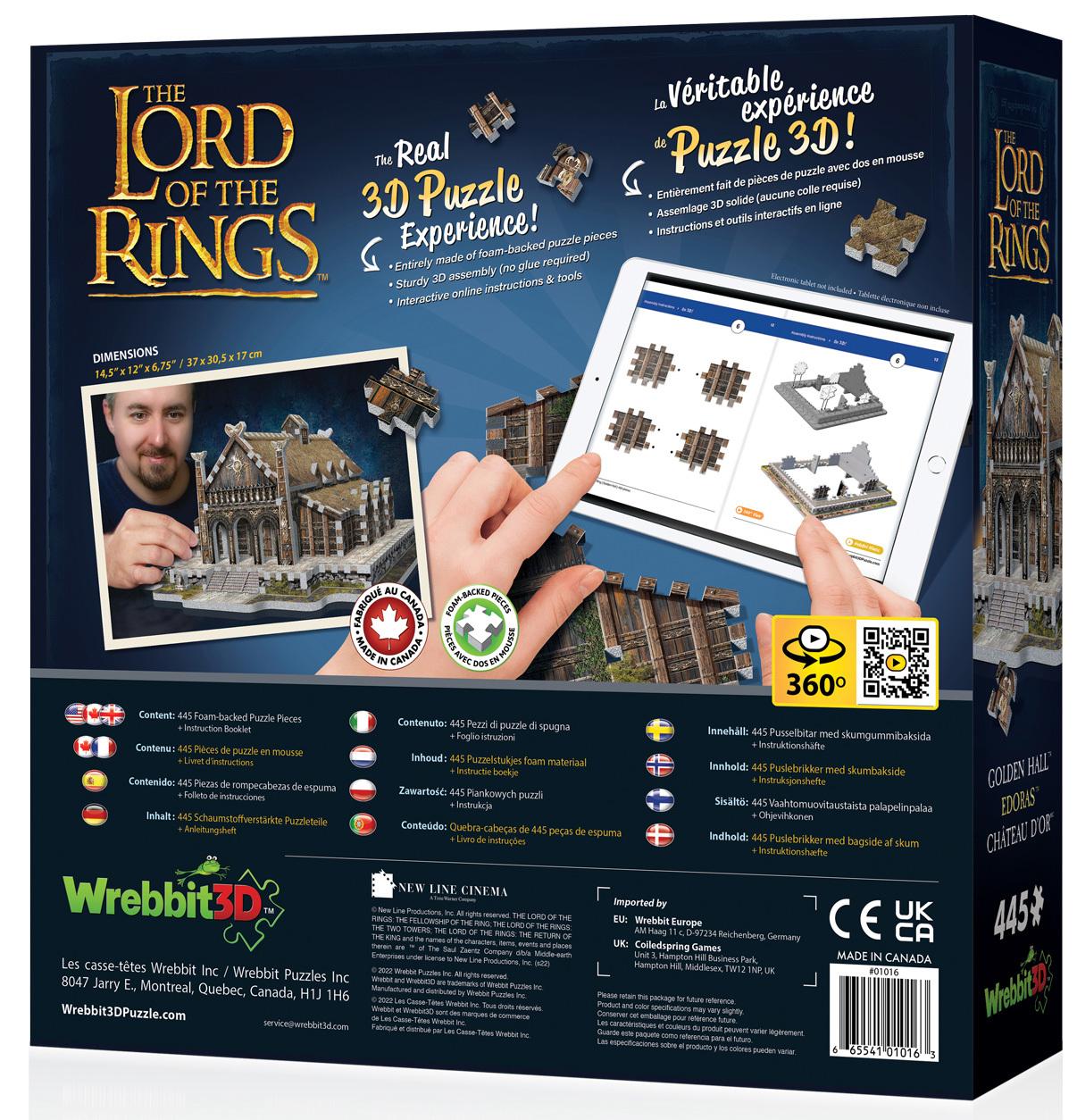 Climb the steps and reach Golden Hall atop a hill overlooking Edoras and part of the Rohan territory. Puzzle this renowned Great Hall, also known as Meduseld, home of the king of the Rohirrim, a fierce nation of horsemen to be reckoned with in Middle-Earth. Filled with rich tapestries depicting legendary scenes of prowess and battles, this golden straw-roofed mead-hall will reign in your Lord of the Rings collection!Immerse yourself deeply into Tolkien’s adventurous high fantasy world with this 445-piece 3D jigsaw puzzle of the Golden Hall. Watch out for Grima Wormtongue; he might still be lurking in the throne room!