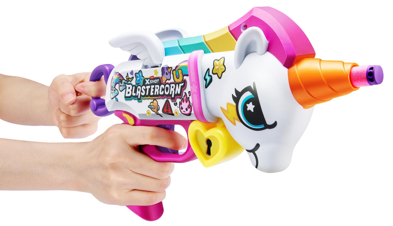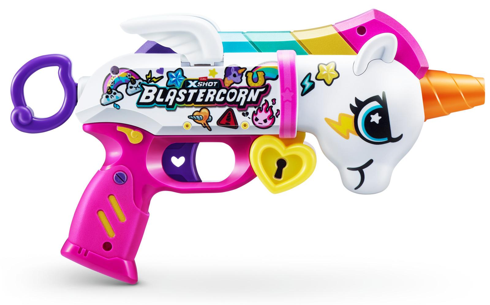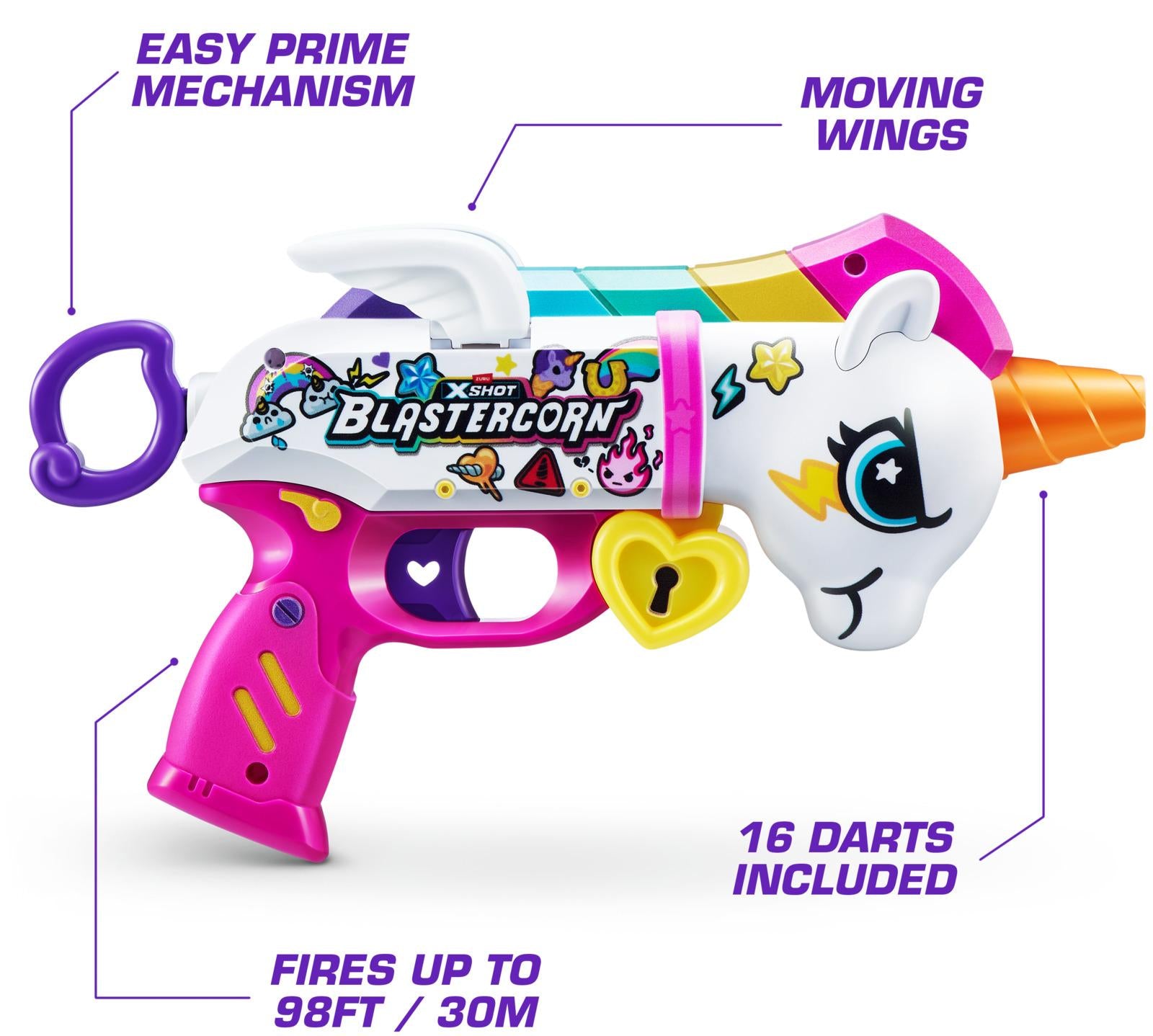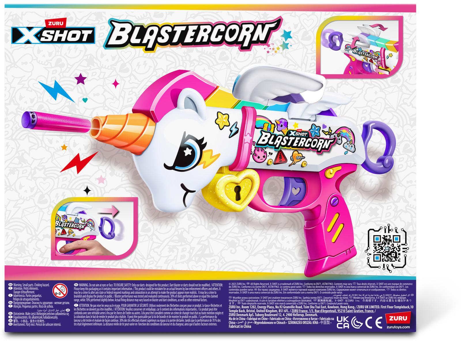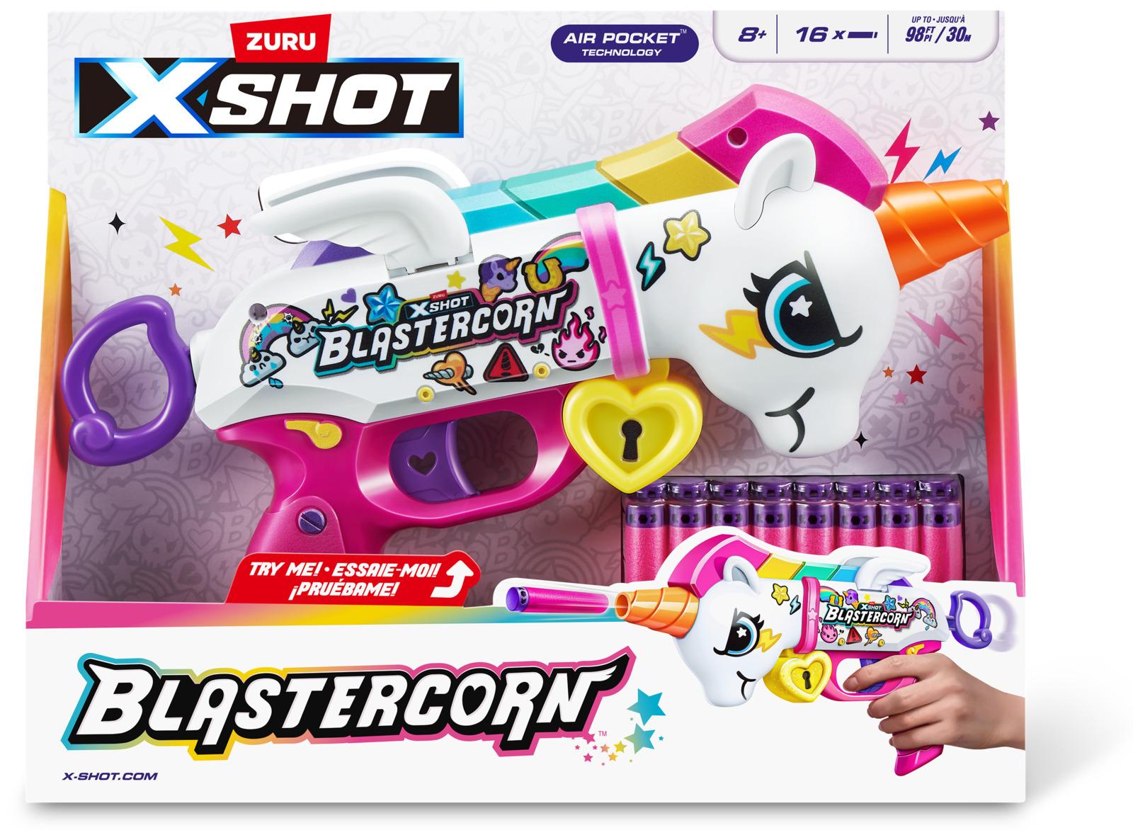 *Are you game to tame the Blastercorn?*Introducing the newest member in the XSHOT family, the Blastercorn! Unleash 16 Air Pocket Technology foam darts in seconds with the Blastercorns simple pull to prime reload. With a powerful range of 27m/90ft, the XSHOT Blastercorn takes on targets effortlessly. Watch its wings flap as you unleash the power of the Blastercorn on your enemies!*Features:** Hit multiple targets up to 27m / 90 feet away.* Unleash all 16 included darts on your enemies!* XSHOT Blastercorn comes in a unicorn-themed skin!* The XSHOT Blastercorn has a single dart capacity pull to prime.* XSHOT Blastercorn includes Air Pocket Technology darts for a further, faster, and more accurate blast!*Suitable for ages 8 years and up**Please Note:*_Caution: Do not aim at eyes or face.__To Avoid Injury: Use only darts designed for this product.__Warning: Choking Hazard: Small parts may be generated.__Not for children under 3 years._