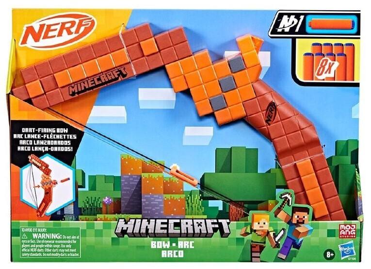 *Nerf: Minecraft – Bow*Nerf and Minecraft combine to create distinctive blasters for your Nerf battles! The Nerf Minecraft Bow takes its inspiration from the bow in the popular game. Experience the long-range bow-firing action of the game in real life as you draw the string back and release it to let the dart fly!The Nerf Minecraft Bow includes 8 x Official Nerf N1 darts designed for extreme accuracy, speed, and distance. The single-dart capacity bow, with true-to-game features, is an eye-catching addition to Minecraft collections and an incredible blaster to add to Nerf cache. The Minecraft-inspired bow is great for backyard adventures as kids imagine themselves diving into the world of Minecraft. Eyewear is recommended (not included).*Features:** This dart-blasting Nerf Minecraft bow takes its inspiration from the bow in the Minecraft video game.* Dart-Firing Bow: Launch into battle and aim at your targets by firing the Nerf Minecraft Bow.* Includes 8 x Nerf N Series N1 Darts: Experience extreme accuracy, and speed, with high-performance compatibility.* String Priming: Pull back the string for real bow action! Release the string to fire the dart.* 3 Easy Steps: Load the N1 dart into the barrel, pull back the bowstring and release the string to send the dart flying.* Minecraft Gifts for Boys and Girls: Nerf Minecraft blasters are great backyard toys for boys and girls and are perfect for any Minecraft player’s collection.* Ages: 8 years and above.* To Avoid Injury: Warning: Do not aim at eyes or face. The use of eyewear is recommended for players and people within range. Use only official Nerf darts. Other darts may not meet safety standards. Do not modify darts or blaster.* Warning: Choking Hazard: Small parts may be generated. Not for children under 3 years.*Suitable for Ages 8+*