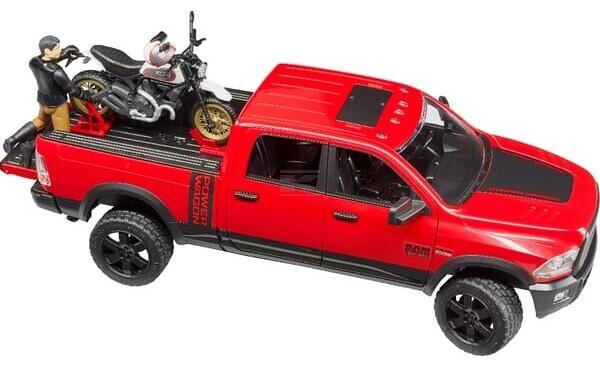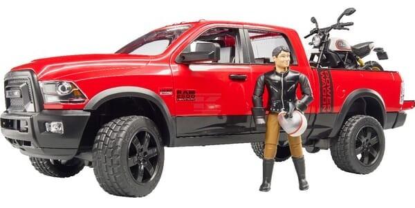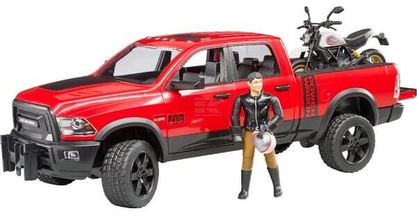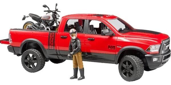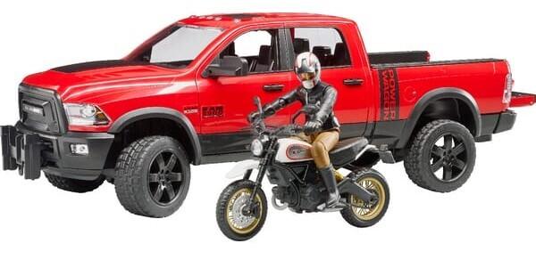 \*\*Bruder: 1:16 RAM 2500 Power Wagon with Ducati Desert Sled \*\*Many people consider motorcycling a pure passion. thanks to scrambler models, premium motorcycle brand ducati has landed a genuine hit with aficionados. the desert sled is an enduro model featuring studs on its profiled off-road tyres mounted on three-spoke wheels. the design stands out and not only captivates veteran motorcyclists, but also the younger generation of riders.*Features:** Rider with authentic clothing, helmet and gloves* Motorcycle with steered front fork, spring-loaded swinging fork and folding side stand* Spring-loaded front and rear axles with 4 steel strings* Incl. removable drawbar coupling*Suitable for Ages 4+*