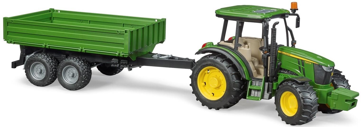 The John Deere 5115M is the star of the compact tractor class on the farm. The large cab is stands out with plenty of space for drivers to move. Powerful and efficient engine. Versatility is its special feature. Regardless of whether the tractor is transporting goods on-road or it is being used with attachments on the field, the performance of this tractor will always confirm you made the right choice. The toy is no different. As usual, model-type design linked with durability and versatile functions make it compatible with the vast range of BRUDER agricultural units. Its steering makes it agile and an additional drag link allows steering through the sliding roof, just like the big BRUDER models. The tandem-axle trailer is the ideal companion with its tilting platform and fold-downside gates. This appealing and competitively priced tractor and tandem transport trailer is the ideal addition to bworld theme worlds.* detachable front weight* receiver for front loader* standard front and rear coupling* steerable and off-road front axle* tread tyres* additional steering rod allows steering through the sliding tractor roof*Suitable for ages 4+**Made in Germany*_Bruder is a German company whose products are developed as model-sized toys. These high quality toys encourage children to imitate real life in the form of role playing. The high level of functionality of the toys help children understand the technical world by allowing them to “grasp by grabbing.” Special attention is paid to the well-balanced interaction of easy-to-handle play functions and models that are true to life and offer the greatest possible level of stability._