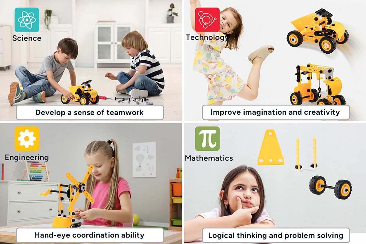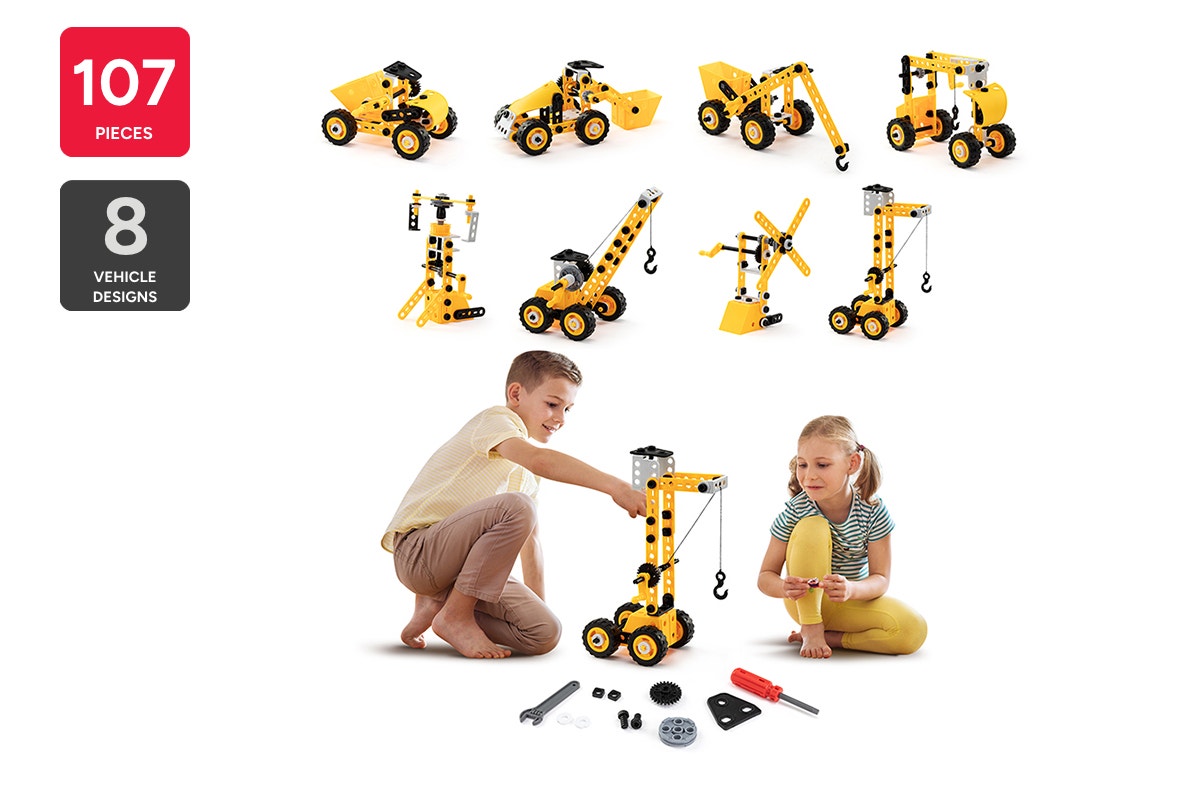 p{font-weight:bold;font-size:1.2em}. Unleash your child’s creativity with this 107-piece construction vehicle set that builds 8 different models. It's a perfect hands-on way to develop problem-solving skills while having endless fun.* *107 pieces.* Builds 8 different construction vehicles.* *STEM learning.* Encourages problem-solving and creative thinking.* *Safe materials.* Made of non-toxic ABS for safe play.* *Suitable for 5+ years.* Designed for young builders.* *Includes instructions.* Easy-to-follow assembly guide for all models.p{font-weight:bold;font-size:1.2em}. Builds 8 unique construction vehiclesThis set includes 107 pieces that can be used to build 8 different construction vehicles, from diggers to cranes. Kids can use their imagination while assembling each vehicle, gaining a sense of accomplishment when they complete their build. The versatility of this set offers your child hours of fun and exploration.p{font-weight:bold;font-size:1.2em}. Promotes STEM learningBeyond the fun, this building set is an excellent tool for fostering STEM learning. It helps kids develop important problem-solving skills and encourages creative thinking. As they figure out how each piece fits together, they also improve their concentration and fine motor skills - perfect for educational play.p{font-weight:bold;font-size:1.2em}. Safe and easy for kidsMade from safe, non-toxic ABS material, this building set is suitable for children aged 5 and above. The included assembly instructions make it easy for kids to follow along, so they can independently build each vehicle with confidence.