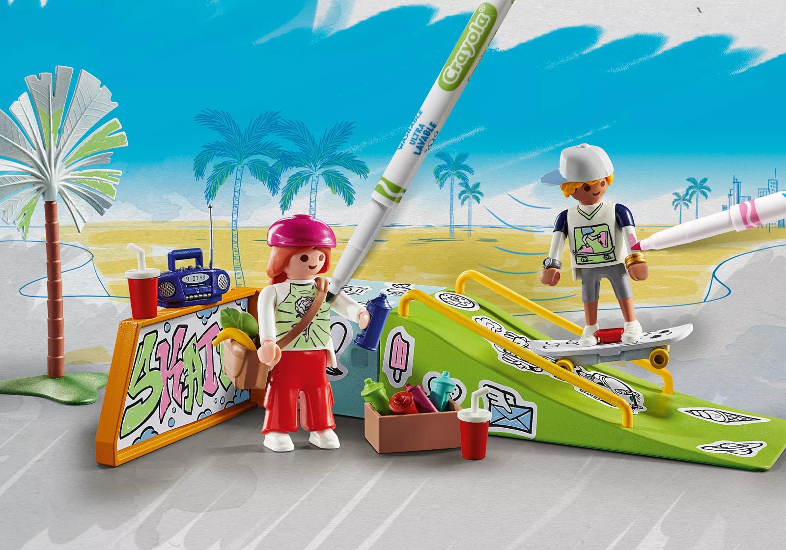 *Playmobil: Color Skate Park (71515)*Add color to your play with the cool PLAYMOBIL Color Skate Park. Enjoy creative coloring fun with the washable markers.Experience sports, action, and coloring fun with the PLAYMOBIL Color Skate Park! It's not just about skating; it's also about getting creative. The graffiti artist gives the walls a unique look, while the skater performs daring tricks on the ramp. The skateboard's foot clamp can be used flexibly for different figures. With specially coated labels and washable markers, kids can create their own designs and recolor the surfaces again and again. The included sponge allows for precise corrections. Discover the joy of skating and creative expression with the PLAYMOBIL Color Skate Park – a must-have for young artists!*Contents:** Figures: 1 man with cap, 1 woman with cap and shoulder bag* Accessories: 1 ramp with platform section and wall element, 1 palm tree with base plate, 1 boom box, 1 crate, 5 paint spray cans, 1 skateboard, 2 drinks with straw, 4 thin Crayola pens, 1 sponge, 1 paintable and washable sticker sheet*Suitable for Ages 5+*