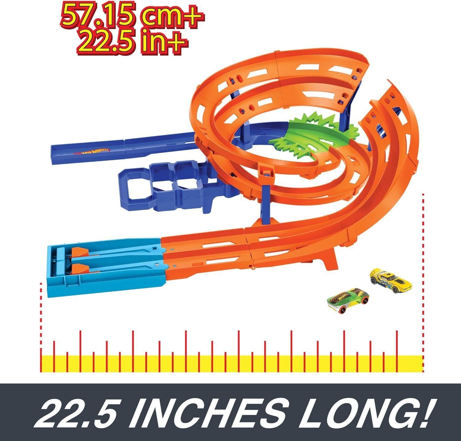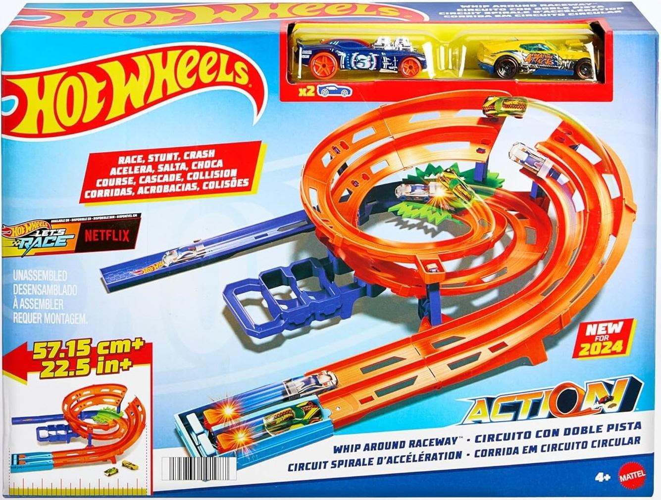 *Hot Wheels: Action – Whip Around Raceway*Race two Hot Wheels cars on side-by-side tracks, stunt over a gap-jump and escape the crash zone to be the first to finish the Whip Around Raceway! This classic Hot Wheels track set packs all the action and fun of racing and stunting and includes two 1:64 scale vehicles to start racing right out of the box. The set folds in half for convenient storage, and the handle makes it easy to carry. Store cars in designated spots on the handle to keep everything in one place. Colors and decorations may vary.*Features:** Get ready for head-to-head racing, stunting and crashing!* Two Hot Wheels 1:64 scale vehicles are included to start racing right away!* Load the vehicles into the launchers and send them racing across a wild track* That includes a gap-jump and crash zone before reaching the finish line!* The set folds in half and features storage for 2 toy cars on the handle.* This Hot Wheels Track Builder set makes a great gift for kids 4 years old and up.*Suitable for ages 4 & up*
