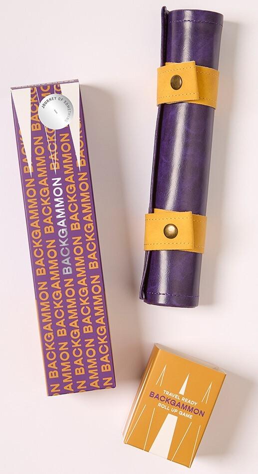 The Journey of Something backgammon Game features a compact, roll up design with press stud closures. Your dice and pieces fit snugly into the zip compartment meaning you can take it anywhere and never lose a piece.Choice faux leather and high quality stitching means you will not only be the Backgammon master, but also the most stylish. You have won before the game has even started.Backgammon is a great two player dice game, popular around the world for young and old. Backgammon uses a mixture of skill and some luck of the dice.*Contents:** 1 x Roll up Board (36 × 24cm when extended)* 1 x Box with base that can be used as a dice cup (25 × 5.5 × 5.5cm)* 15 x Purple Tokens* 15 x Mustard Tokens* 2 x Purple Dice* 2 x Mustard Dice* 1 x Doubling Dice