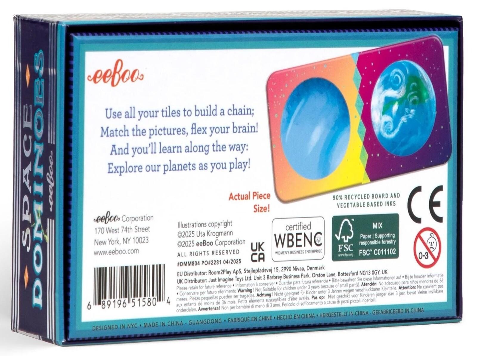 *eeBoo: Mini Dominoes – Space*This bold, shiny take on a beloved classic offers a cosmic introduction to the game of dominoes. Each dazzling domino piece features two planet panels with silver, holographic foil.The set includes classic-sized pieces.*Features:** Players: 2–4* Playtime: 15 Minutes* Ages: 3+*Contents:** 28 holographic, domino tiles* Instructions inside box top* Sturdy storage box*Specifications:** Perfect for players young and old. A game and gift the whole family can enjoy. Includes insert identifying planets.* Develops Matching and Concentration Skills* Sustainably Sourced: Made with recycled board and printed on FSC®-certified paper using vegetable-based inks.* Pieces: 2.75" x 1.375"* Box: 6" x 3" x 1.5"
