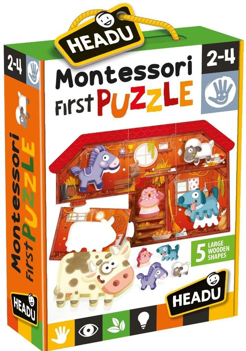 *_Headu: Montessori First Puzzle – The Farm_*Learn about farm life and develop sensory coordination!Children can put together the puzzle and have fun inserting the chunky wooden animals in the correct spaces. Stimulate learning with explanations of the different animals, barn features, and objects in the picture, then use questioning techniques to reinforce the child's understanding.*Features:** Main Intelligence: Bodily-kinesthetic* Skills: Touch and manual skill* Learning Objectives: Tactile sensitivity; Fine manual skill; Sensory development; Recognition of shapes and animals* Topic/Context: A farm barn* Game Type: Puzzle with chunky wooden feature pieces* Age: 2–4 years* Contents: Puzzle made up of 6 shaped pieces; 5 wooden animals