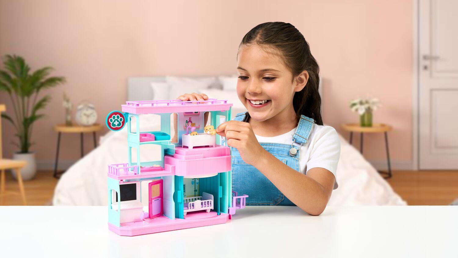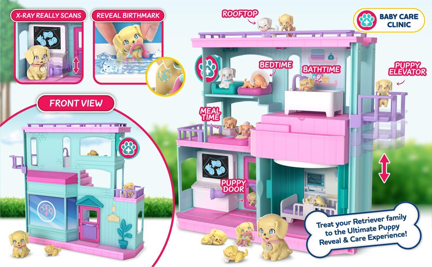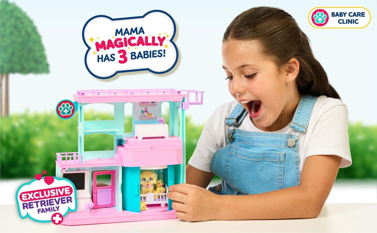 Experience the surprise and delight of Little Live Pets Mama Surprise Families—the most adorable and fun micro-sized collectibles with over 80 moms & pups to collect across season 1! Little Live Pets Mama Surprise Families Baby Care Clinic is a fun-filled playset that delivers the ultimate Mama Surprise Families play experience! Scan Mama on the X-ray to see how many puppies she’s expecting.Care for Mama, place her in the hospital bed, close the curtains, and open them to reveal a new baby! Repeat to discover 2 more babies. Bathe them in the tub to reveal secret birthmarks. With 5 fun accessories and so many play areas to explore, there are endless ways to care for your new Retriever family – exclusive to this playset, each with their own poses and personalities. Get ready to fall in love with Mama Surprise Families!*Features:** Mama magically has 3 babies! Help Mama get ready using the x-ray that really scans!* Care for Mama – wipe her cheeks with water and watch her cheeks turn rosy so she is ready to reveal her babies!* Place Mama into the hospital bed and draw the curtains. Open them again and reveal a baby! There are 3 Retriever babies to discover.* Wash each baby in the bath and discover a cute little birthmark on each one!* This double sided Baby Care Clinic comes with 5 accessories and areas for bath time, play time, meal time and an elevator to go up and down!* Suitable for ages 5+