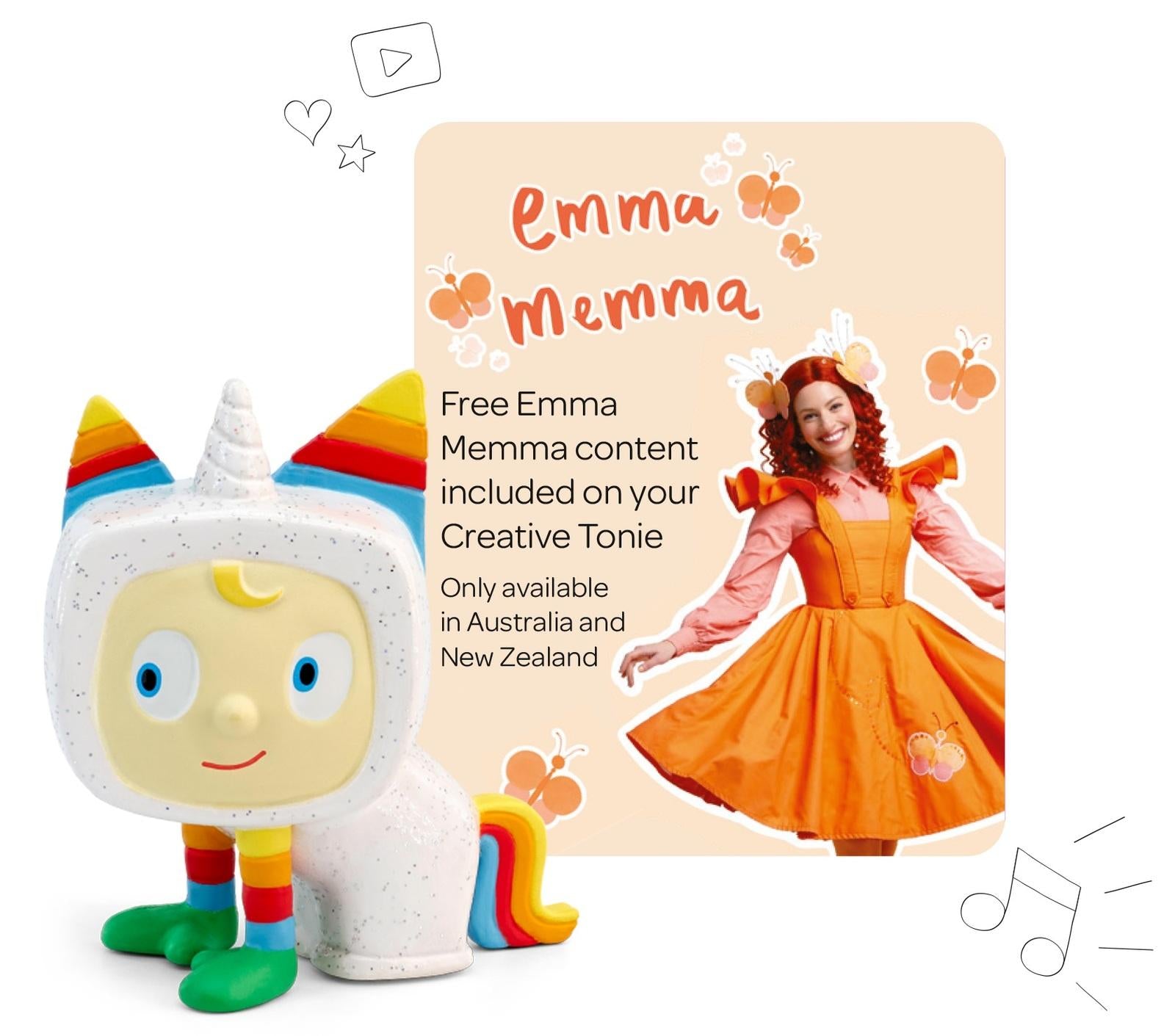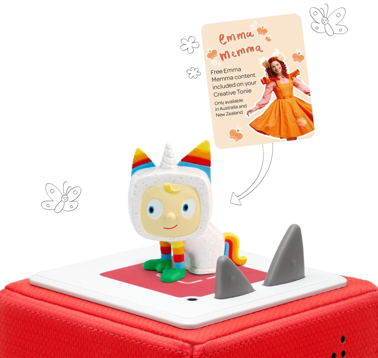 *Tonies – a new audio experience designed for little listeners!*The Creative-Tonie Unicorn already includes some fun songs from Emma Memma from the Audio Library. So Sing, dance and sign along to Emma Memma's latest songs like ‘Twirl with Emma’, ‘Coconut Tree’, ‘Pasta Necklace’ and many more on your Creative-Tonie.Creative-Tonies are just like Tonies – hand-painted, pretty tough… but with the space to fill them with 90 minutes of whatever you like. Just upload audio using your computer, tablet or smartphone. Creative-Tonies are the perfect way to record all your own messages and content, each one fits up to 90 minutes of stories, music messages or educational content on them. You can even ask a grandparent or family member to record you a message. Happy recording! To get you started, just log into your mytonies account and head to the Audio Library to benefit from free content.*Specifics:** *Recommended Age* – 3+* *Read by* – Emma Memma* *Features* – Magnetic, hand-painted* *Contents* – 1× Tonie* *Material* – Plastic* *Running Time* – approx. 90 minutes including approx. 27 minutes of Emma Memma content*Tracklist:*1. Intro2. Twirl Twirl With Emma3. Coconut Tree4. Pasta Necklace5. Wave Goodbye To The Sun6. Boop on Your Nose7. Elvin Melvin Yeah!8. I See You With My Glasses9. Dino Dig10. Wombat Butterly Drum11. Come And Join Us12. Waffles The Wombat13. Making Monday14. Twirly Tuesday15. Wombat Wednesday16. Thank You Thursday17. Friendship Friday18. Sporty Saturday19. Signing Sunday