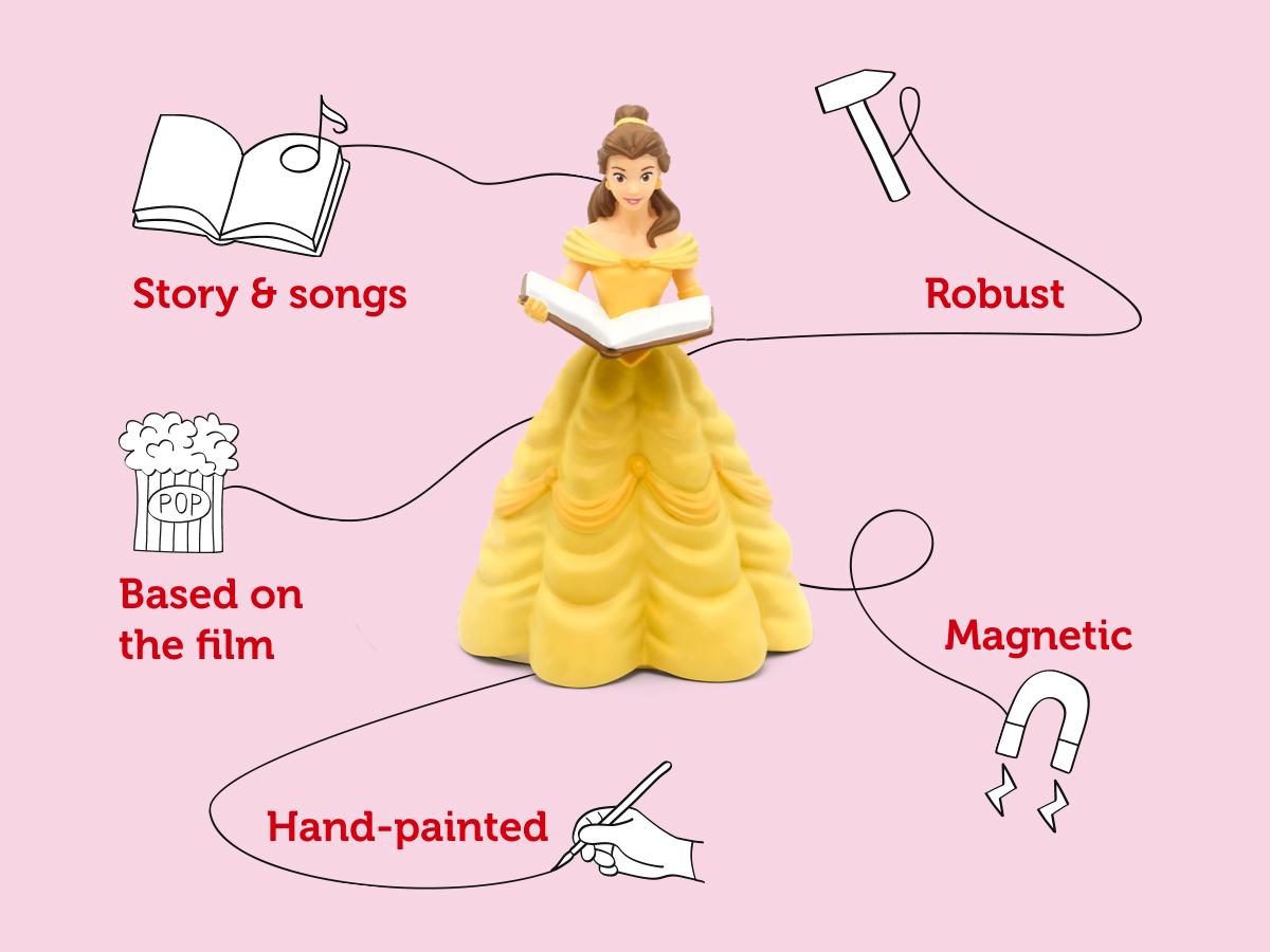 *Tonies – a new audio experience designed for little listeners!*It’s a tale as old as time, and it’s coming to the Toniebox. Join Belle and other favourite characters from Disney’s Beauty and the Beast for a marvellous musical medley.Be our guest, be our guest… Just pop this Tonie on the Toniebox and come on in to the Beast’s magical castle, where Lumiere, Cogsworth and Mrs Potts are waiting to dish up some delicious songs and stories from Disney’s Beauty and the Beast. It may be a tale as old as time, but with this Tonie your little listeners can dive into Belle’s magical world whenever they like. Whether they’re sitting in the car, snuggling on the sofa, or lying down in bed, she’s ready to whisk them off for a marvellous musical medley that’ll leave them spinning and singing. With 4 songs from the much-loved film including ‘Be Our Guest’ as well as a reading of the story, this Tonie will definitely delight little ears.Tonies are characters that feature content, stories and songs from an ever-growing collection of modern favourites and timeless classics. Swapping stories is as simple as changing the Tonie on your Toniebox. Each Tonie is unique and includes its own selection of child-friendly content. (Artists performing tonies songs and stories may differ from those performing original licensed content.)*Specifics:** *Recommended Age* – 4+* *Running Time* – approx. 35 minutes* *Read by* – Roy Dotrice* *Features* – Magnetic, hand-painted* *Contents* – 1× Tonie* *Material* – Plastic*Tracklist:*1. Belle2. Gaston3. Be Our Guest4. Something There5. Beauty and the Beast6. *tonies Story:* Beauty and the Beast