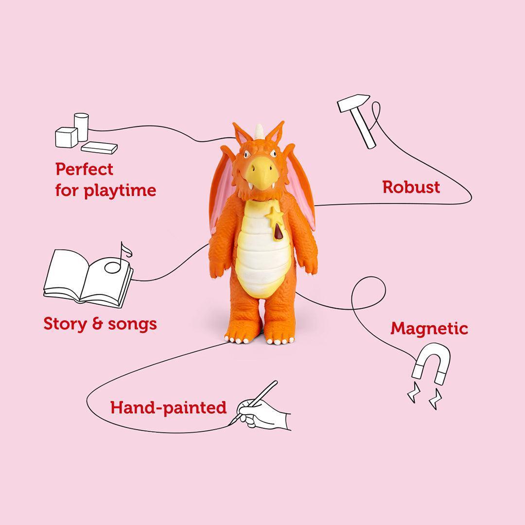 *tonies: Stories – Julia Donaldson (Zog)*The Tonies Zog character magnetically attaches to the Toniebox (sold separately), allowing you to listen to something different every time. Switch with different Tonie characters and quickly jump between audiobooks, music or your own interactive audio adventures.Zog is the keenest dragon in school. He’s also the most accident-prone, flying into trees and even setting his own wing on fire. Luckily, a mysterious little girl always comes by and patches up his bumps and bruises. But will she be able to help Zog with his toughest test…Tonies are characters that feature content, stories and songs from an ever-growing collection of modern favourites and timeless classics. Swapping stories is as simple as changing the Tonie on your Toniebox. Each Tonie is unique and includes its own selection of child-friendly content. (Artists performing tonies songs and stories may differ from those performing original licensed content.)*Specifics:** *Recommended Age* 4+* *Running Time* – approx. 20 minutes* *Features* – Magnetic, hand-painted* *Contents* – 1× Tonie* *Material* – Plastic*Tracklist:*01\. Zog – the classic story02\. Flying Doctors Song03\. Zog’s Listening Game04\. Flying Doctors Song – instrumental version