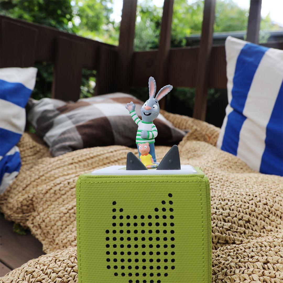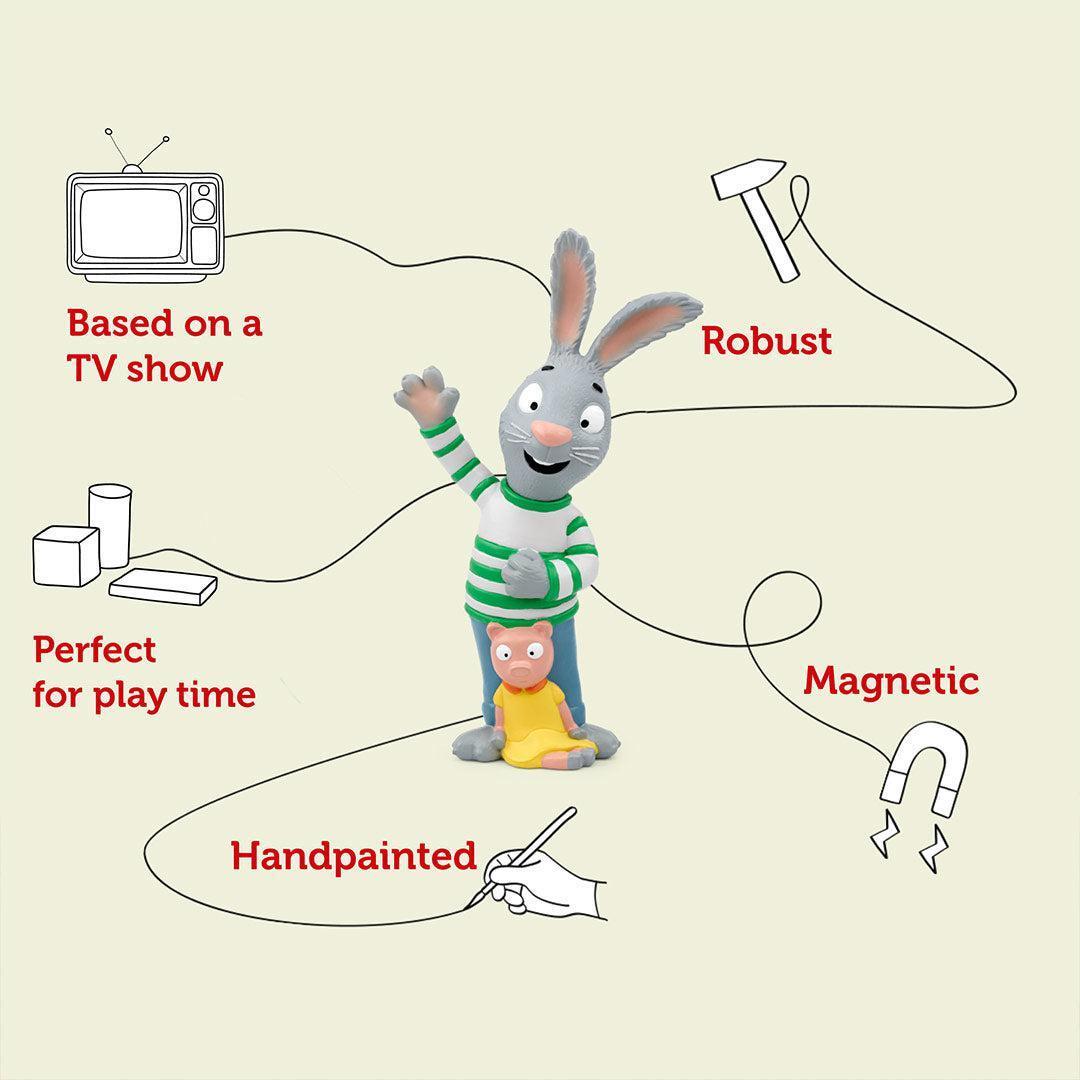*tonies: Stories – Pip and Posy (Pip)*The Tonies Pip And Posy – Pip magnetically attaches to the Toniebox (sold separately), allowing you to listen to something different every time. Switch with different Tonies and quickly jump between audiobooks, music or your own interactive audio adventures. Do you know a little bunny who’d love to play with Pip and Posy? Well, have them pop Pip here on top of a Toniebox and let the games begin…Based on Gruffalo illustrator Axel Schefflers books, and narrated by actress and author Giovanna Fletcher, this Tonie includes a collection of six stories and a marvellous music quiz all about best friends and expert play rangers Pip and Posy. Makes a champion playtime companion and a brilliant travel buddy – because no matter where or when a little listener tunes in, it’s always fun with Pip and Posy around.Tonies are characters that feature content, stories and songs from an ever-growing collection of modern favourites and timeless classics. Swapping stories is as simple as changing the Tonie on your Toniebox. Each Tonie is unique and includes its own selection of child-friendly content. (Artists performing tonies songs and stories may differ from those performing original licensed content.)*Specifics:** *Recommended Age* 3+* *Running Time* – approx. 60 minutes* *Features* – Magnetic, hand-painted* *Contents* – 1× Tonie* *Material* – Plastic*Tracklist:*01\. Lucky Stick (Story)02\. A Good Scare (Story)03\. Bob the Balloon (Story)04\. Croc Attack (Story)05\. Star Search (Story)06\. Swapsies (Story)07\. The Music Quiz