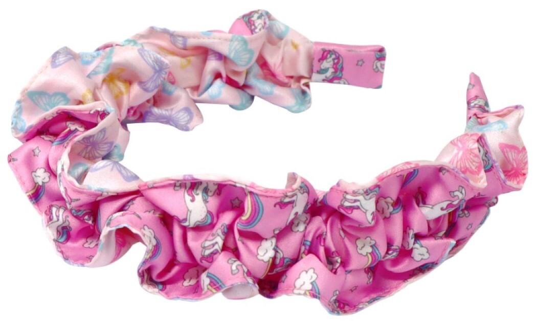 *Pink Poppy: Reversible Ruffle – Headband*The reversible ruffle headband is a lovely and versatile item that complements every outfit. It has 2 separate and bright patterns, one of which features a vibrant pink background adorned with playful unicorns, rainbows, and clouds.In contrast, the opposite side features a soft pastel palette accented with delicate motifs, ideal for individuals who want a more understated appearance. This headband, made of a smooth, satin-like material has a beautiful, feminine look and is comfortable to wear all day. Whether you're a unicorn enthusiast or simply seeking to infuse some vibrancy into your style, this headband is the ideal choice for adding a playful touch to your ensemble and brightening your day.*Features:** 2 ways to wear* Adorable and cute!* One size fits most*Suitable for Ages 3+*