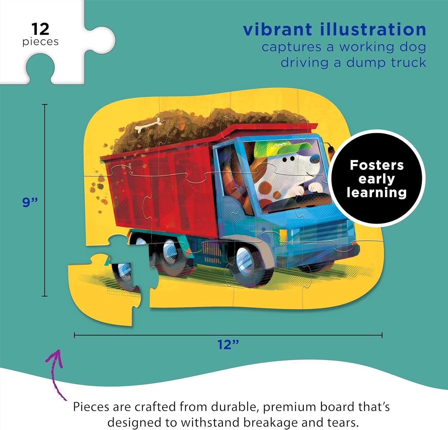 *Crocodile Creek: Go Big Dog – Mini Puzzle (12pc Jigsaw)*Go Big Dog! Our dump truck driving Big Dog puzzle will delight any little enthusiast who is wowed by rumbling giant construction vehicles! Featuring bold colors and a whimsically illustrated puzzle that encourages hand-eye coordination and problem-solving. Great for interaction between a parent and child that can be used over and over. A sturdy box makes for easy storage and its small size is perfect for travel.*Features:** 12 thick puzzle pieces that fit together well for children 2 and older* Encourages hand-eye coordination, fine motor skills and problem-solving* Puzzle pieces are made of strong, high-quality blue board that will not tear or break.* Printed with soy-based inks* Beautifully illustrated artwork on both puzzle and shaped storage box*Suitable for Ages 2+*