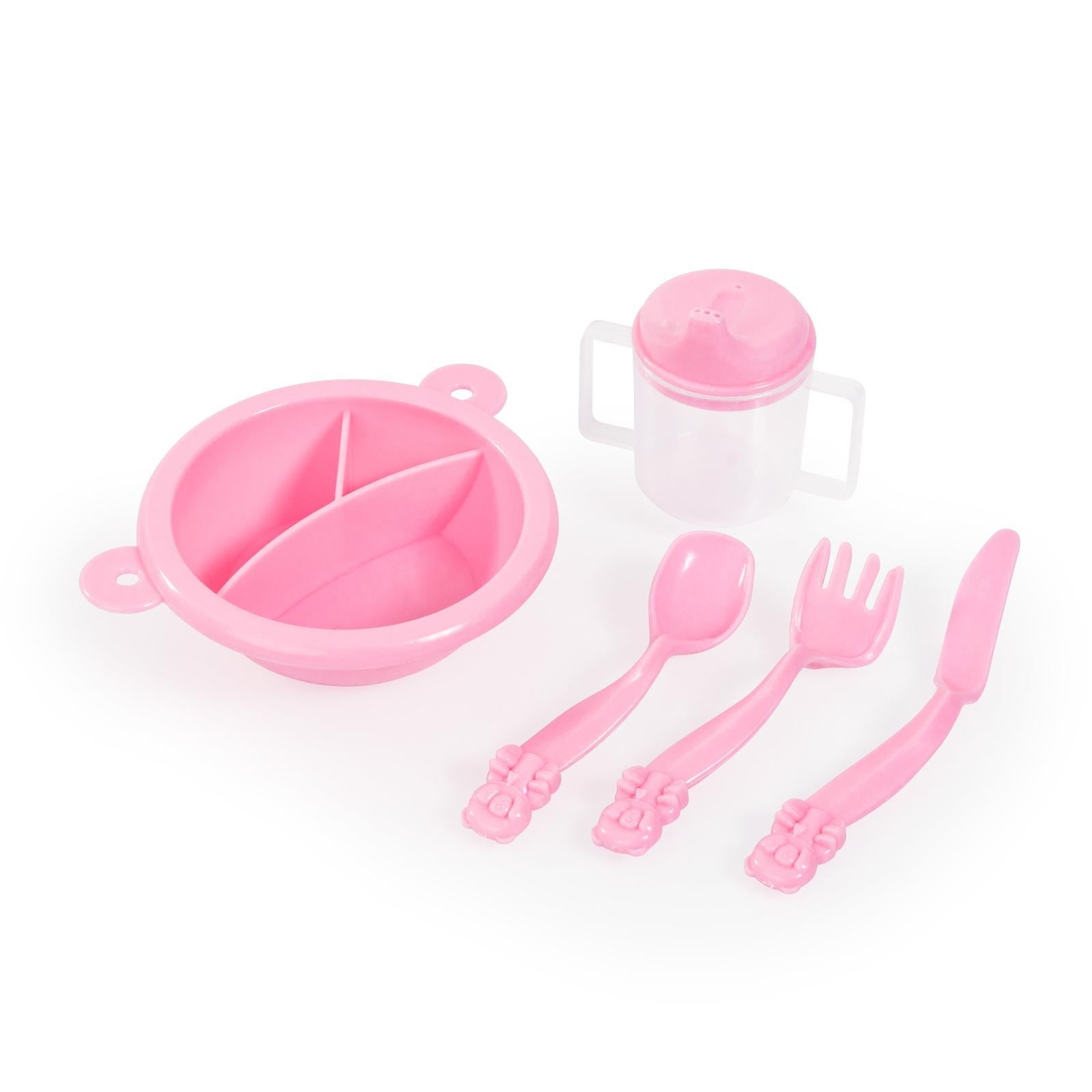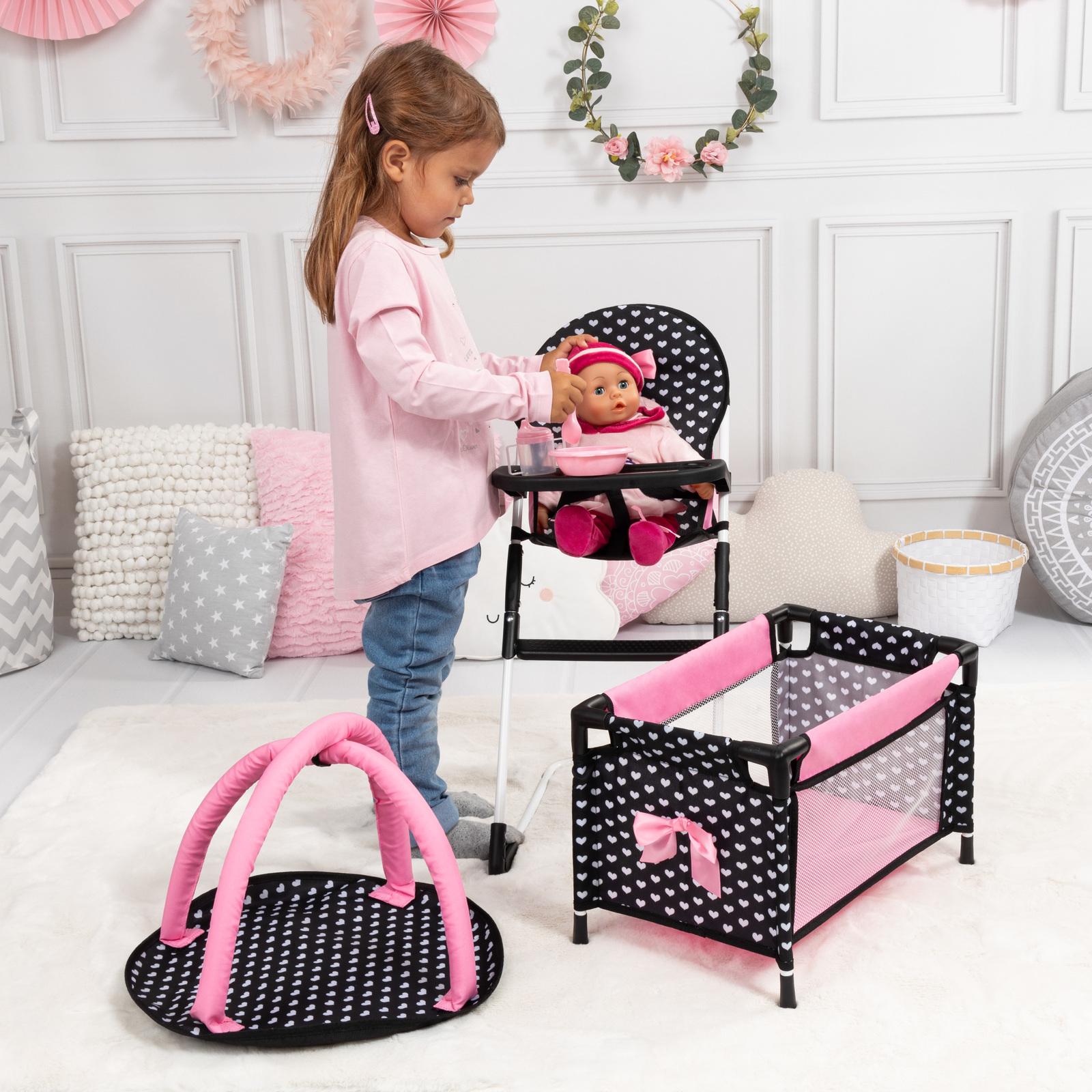 *This lovely doll accessory set consists of a high chair, a doll bed, a play mat, a bag and cutlery*The high chair has a beautiful design and is suitable for dolls up to 46cm. Thanks to its integrated tray children can comfortably feed their doll with the included plate, fork, spoon and cup or bottle. The accessories can be stored in the included beautiful bag.*Features:** For even more play fun, the doll can be laid down under a play arch.* Bedtime! For sweet dreams of the little darling, a travel cot is also included in the set.* A perfect set for imaginative role plays with the doll.* The set is suitable for dolls up to 46 cm.*Suitable for ages 3 years and up*