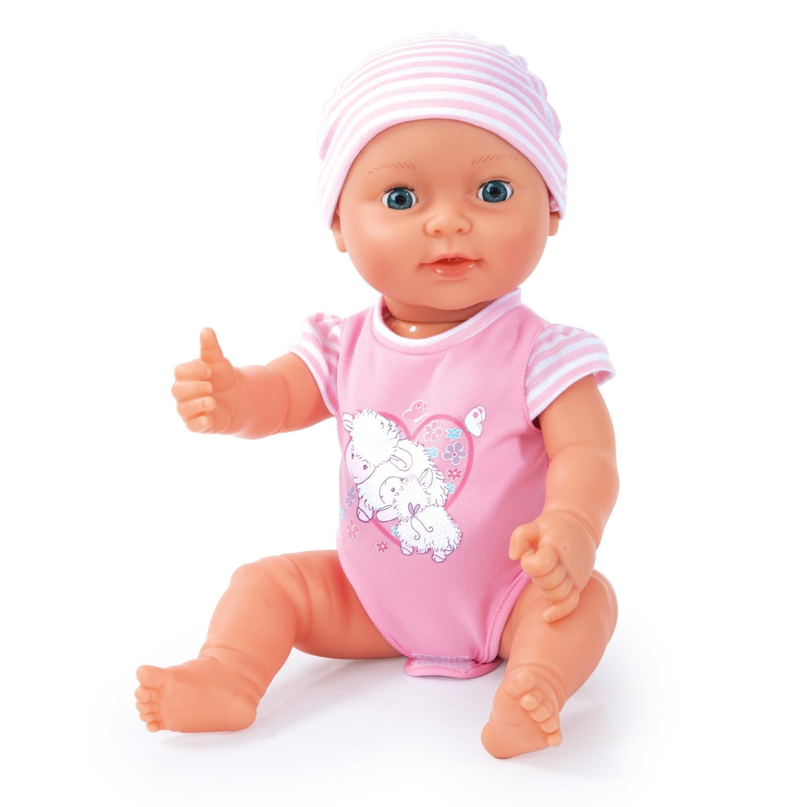 *Bayer: Piccolina – Newborn Baby Doll*Piccolina Newborn Baby is a sweet 16 inch hard-bodied baby doll with accessories and sleeping eyes. When Piccolina Newborn Baby gets her bottle filled with water, she makes wee-wee on her potty. When you put the doll to sleep, she closes her eyes.*Features:** Piccolina Newborn Baby wears a cute body with matching hat.* Thanks to her doll accessories many different role-plays can be realized.* Set includes potty, bottle, pacifier, plastic tableware and a diaper.* The doll will be delivered in a big showbox.* The doll measures approximately 40cm.*Suitable for ages 3 years and up*