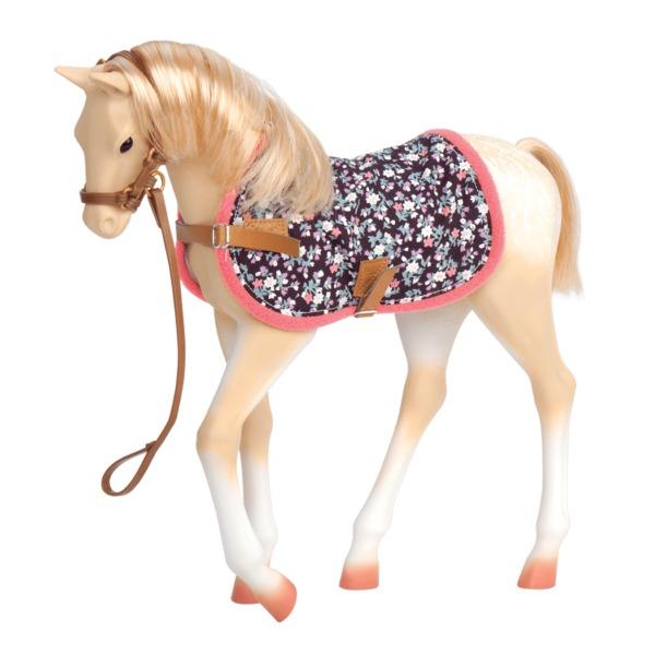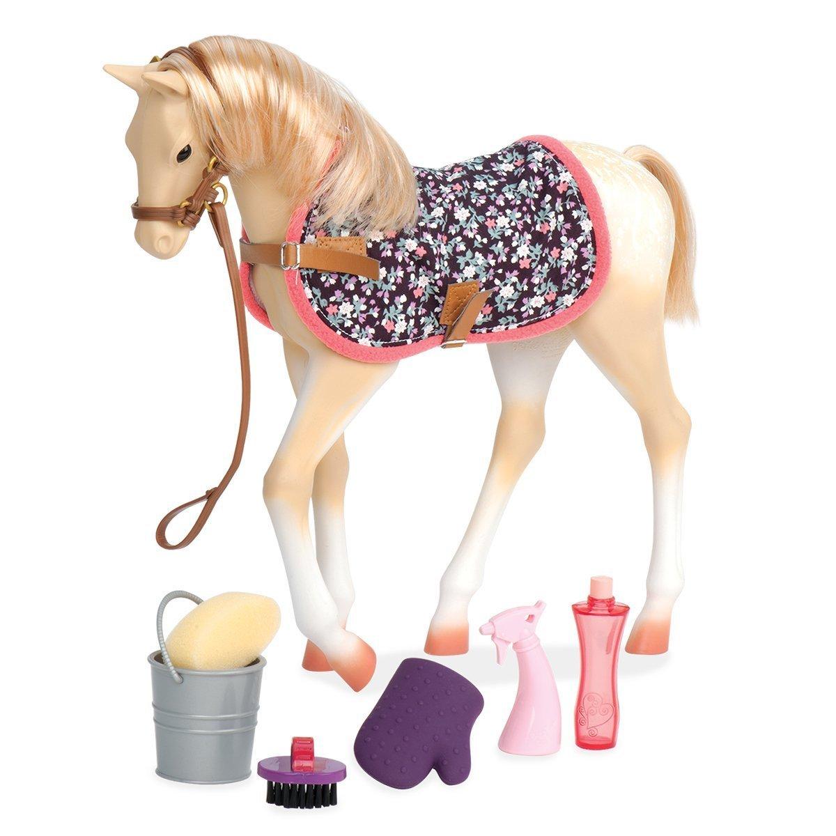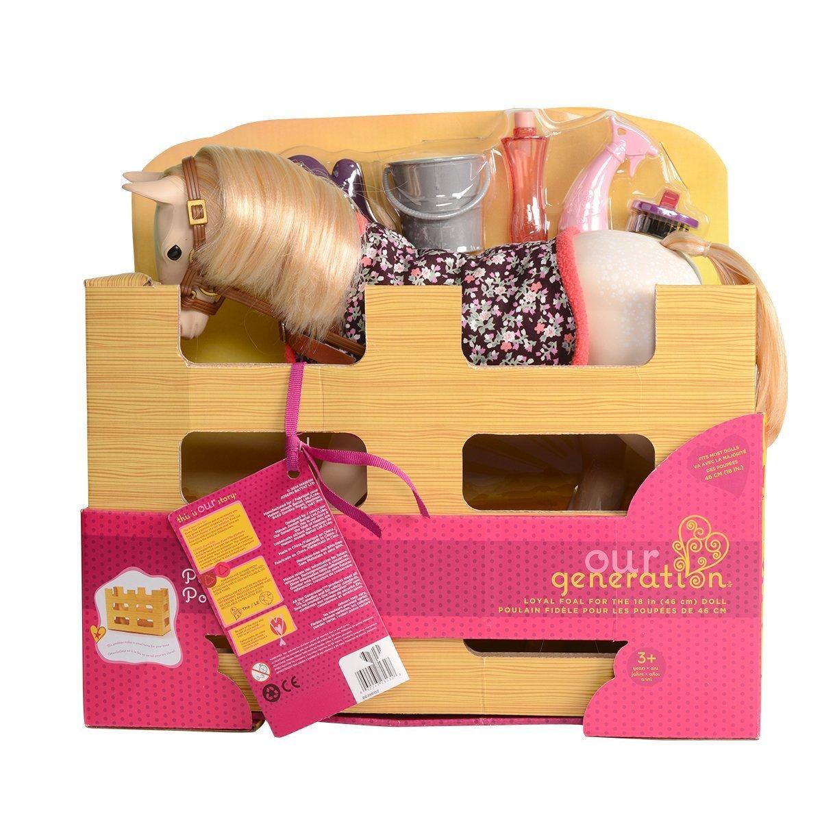 *Our Generation: Horse Play Foal – Palomino*Calling all horse lovers: The Our Generation Palomino Foal play set is just what your child needs to feel like she's taking care of a real horse. Whatever the weather, this Our Generation Palomino Foal is ready for fun and adventure.*Features:** This prize-winning pony comes with her own halter, blanket, care booklet, prize ribbon and more.* There's even a bandana and fanny pack for her owner. Kids can pretend to feed and groom their own little foal with the set's grooming bag, brush, spray bottle, feeder, scoop and nugget bag.* Designed specifically for Our Generation dolls, the horse works wonderfully with all of the OG accessories and dolls your little one adores so much.* Please Note: Doll sold separately*Includes:** 1 Foal* 1 Foal coat* 1 Halter and lead* 1 Grooming brush* 1 Bucket* 1 Sponge* 1 Spray bottle* 1 Shampoo bottle* 1 Grooming mitten*Suitable for ages 3 & up*