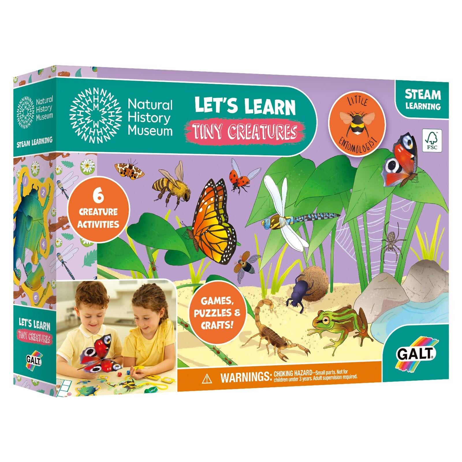 *Galt: Let's Learn – Tiny Creatures*Introducing the Let's Learn Tiny Creatures activity kit, a collaboration between Galt Toys and the National History Museum! This bumper activity set is packed with engaging projects and crafts centered around tiny creatures, insects, and creepy crawlies, perfect for sparking early STEAM learning in children. With six exciting projects that combine fun and learning, perfect for early STEAM (Science, Technology, Engineering, Arts, and Mathematics) development. With six exciting activities included, kids can dive into the world of little creatures through arts and crafts, games, and puzzles. Let their creativity soar as they build a butterfly and dragonfly flapping model, or explore the life cycles of butterflies, bees, and frogs with beautifully illustrated lacing cards. The fun continues with a 24-piece pond jigsaw puzzle, complete with a blue lens to discover hidden creatures lurking in the water.Two find it game boards with 20 playing cards offer hours of entertainment, while two build-a-bug puzzles encourage hands-on learning and creativity. Plus, with two dice and two scratch pictures included, children can unleash their imaginations and uncover colourful creations with the provided wooden tool. Whether they're colouring with crayons, assembling puzzles, or crafting their own tiny creatures, this activity kit is sure to inspire curiosity and creativity in young minds. Get ready to build, create, and learn with the Let's Learn Tiny Creatures activity set!*Features:** Learn all about bugs, flying insects and creepy crawlies with these children's games and crafts set, all about miniature creatures and others you may not have heard of.* Six activities set with beautifully illustrated activity cards to encourage early STEAM learning, and provide fun facts about tiny creatures through fun rhymes.* With engaging activities, reveal scratch art pictures, build butterfly & dragonfly models, complete a 24-piece puzzle, find hidden creatures with a special lens, and more.* To show that we love our planet, there's an extra activity printed on the inside of the box to cut out and make, so our packaging can be reused to provide even more tiny creature fun.* Developed with the Natural History Museum, these kits will inspire a love of the natural world and help develop vital skills.*Suitable for Ages 4+*