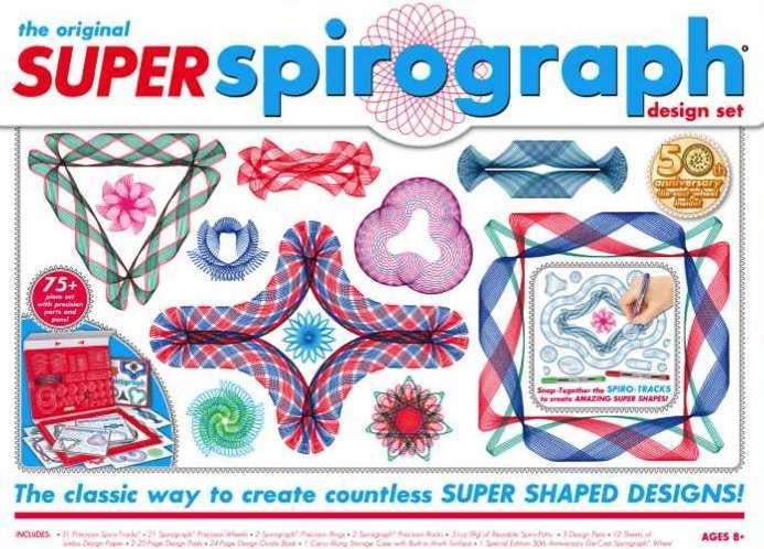 The Original Super Spirograph is back and better than ever. The classic interchangeable Spiro-Tracks let you create your own unique pattern shapes, taking your designs to a whole new and SUPER level. This jumbo 75+ piece set comes in a durable storage case with a work surface and features a real die-cast metal #50 Spirograph wheel to commemorate the 50th*Features:** Anniversary of the introduction of the original Spirograph.* Features all the iconic wheels and rings of the original* Snap-together Spiro-Tracks and a real metal die-cast No. 50 Spirograph wheel to commemorate the 50th Anniversary of the introduction of the original Spirograph* Create endless unique designs* Includes carrying case*Suitable for ages 8 years and up*