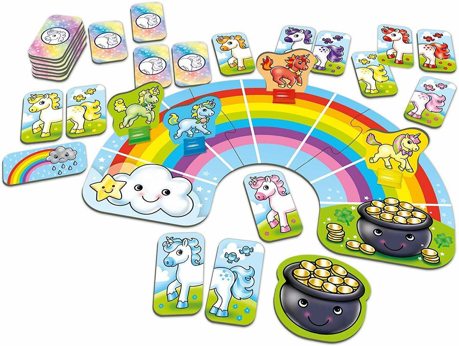 *Gallop over the rainbow towards the pot of gold in this magical, mystical twist on heads and tails!*Players take turns to pick up tail cards and match them to their unicorn heads. For every unicorn they successfully match they move one step closer to winning the magical pot of gold at the end of the rainbow! Featuring friendly unicorn characters and a rainbow playing board that children will love. Younger children can use Rainbow Unicorns as a first matching activity. As they become familiar with different colours they can be encouraged to say the colour aloud as they turn over the unicorn cards.*Features:** A magical colour matching game!* Features colourful unicorn characters* Develops matching and memory skills and colour recognition skills*Contents:** 50 cards* 1 jigged playing board* 4 unicorn playing pieces* 4 character stands* 1 pot of gold piece* 1 instruction leaflet