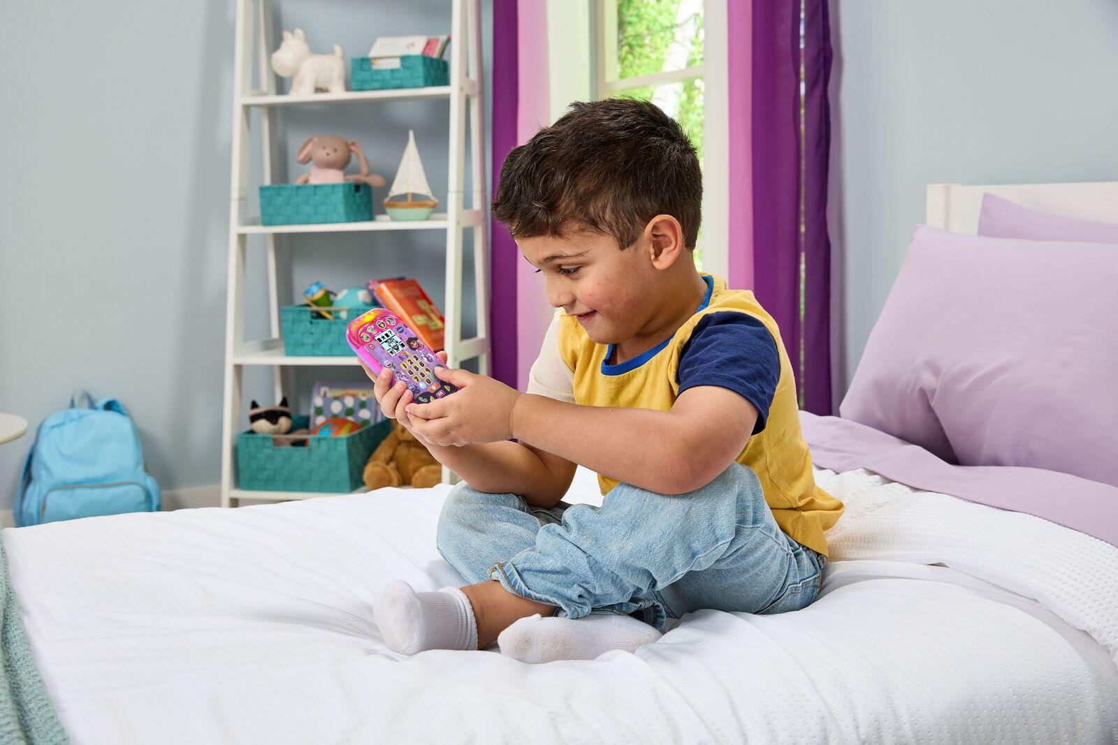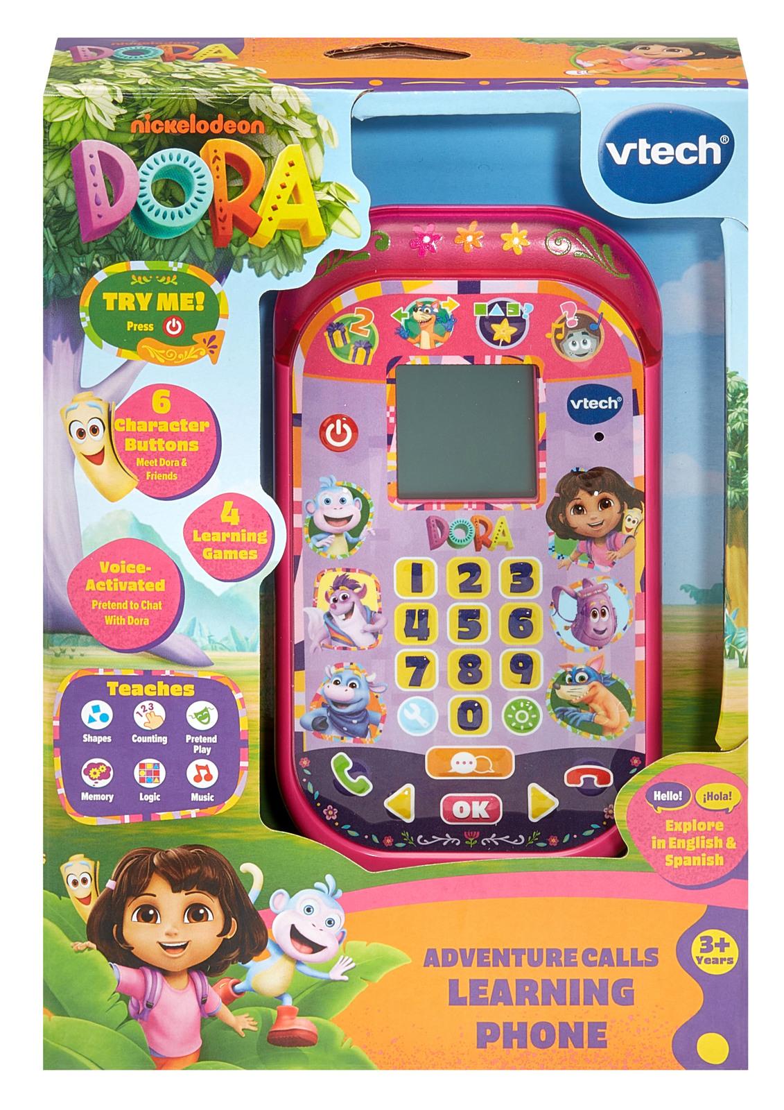 Can you hear the call for adventure?! It's the Dora Adventure Calls Learning Phone by VTech®! Chat with Dora, Backpack, Benny, Tico, Boots, Map and Swiper with this interactive role-play smartphone! Engage in exciting activities and cool features that help test your skills with counting, logic, music recognition, matching and more.You can also leave fun virtual voice messages for Dora, Backpack, Benny, Tico, Boots, Map and Swiper, and use voice activated play to make pretend phone calls! You can choose your own virtual ringtone too, and enjoy exciting responses in both English and Spanish! Features a colour-changing light bar to add to the fun!*Features:** Role-play chat with Dora and her friends!* Play built-in games & educational activities with Boots, Benny, Dora & more!* Choose your own virtual ringtone.* Bilingual learning such as counting and daily phrases in English & Spanish!* Colour-changing light bar.* Features backlit screen and 7 character buttons.* Warning: This toy produces flashes that may trigger epilepsy in sensitised individuals.