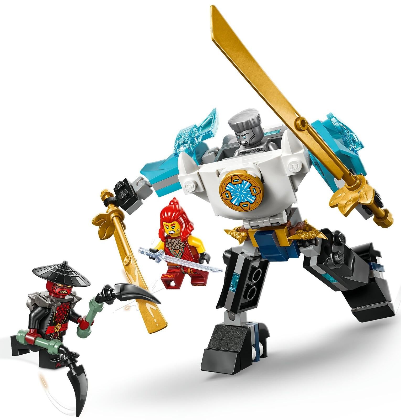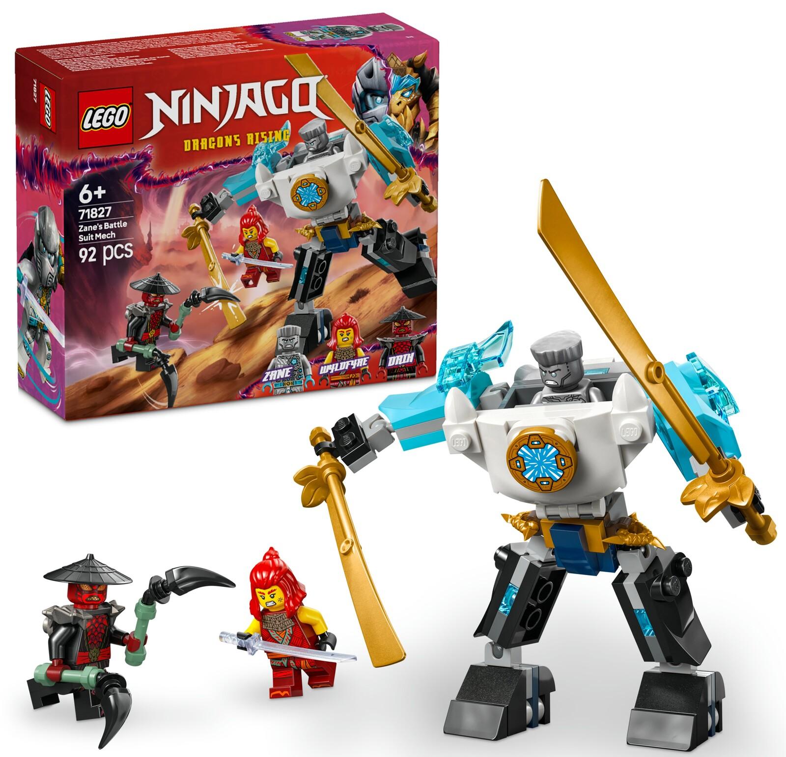 *All-action LEGO NINJAGO toy playset with 3 minifigures*The LEGO NINJAGO Zane’s Battle Suit Mech (71827) pretend play toy set lets boys and girls aged 6 and over stage exciting action from season 3 of the NINJAGO Dragons Rising TV show. This building set for kids features a NINJAGO mech with posable arms, legs and hands, an upper body that rotates through 360 degrees, an opening chest to place a minifigure inside and 2 big sword accessories.This LEGO playset comes with 3 NINJAGO character minifigures: Zane with 2 shuriken accessories, Wyldfyre with a crystal katana sword accessory and Drix, the Master of Swarm from the Forbidden Five, with 2 sickle accessories, so kids can enjoy hours of role-play adventures in the merged NINJAGO world.The LEGO NINJAGO range of sets and buildable action toys includes mechs, dragons and temples so fans can role-play action. Each ninja playset can be created with the LEGO Builder app, which guides you and your child on an easy and intuitive building adventure.*Features:*\* Mech toy lets kids recreate action from season 3 of NINJAGO Dragons Rising\* Zane’s Battle Suit Mech features posable arms, legs and hands\* LEGO set comes with 3 NINJAGO minifigures: Zane, Wyldfyre and Drix\* Each minifigure comes with a weapon accessory for role-play action\* Ninja gift idea for kids aged 6 and over who like to play out thrilling adventures\* Check out other playsets (sold separately) in the LEGO NINJAGO range\* LEGO NINJAGO sets let kids escape into a world of fantasy adventure\* 92-piece ninja mech toy stands over 10 cm (4 in.) tall*Specifics:**Item*: 71827*Pieces*: 92*Ages*: 6+